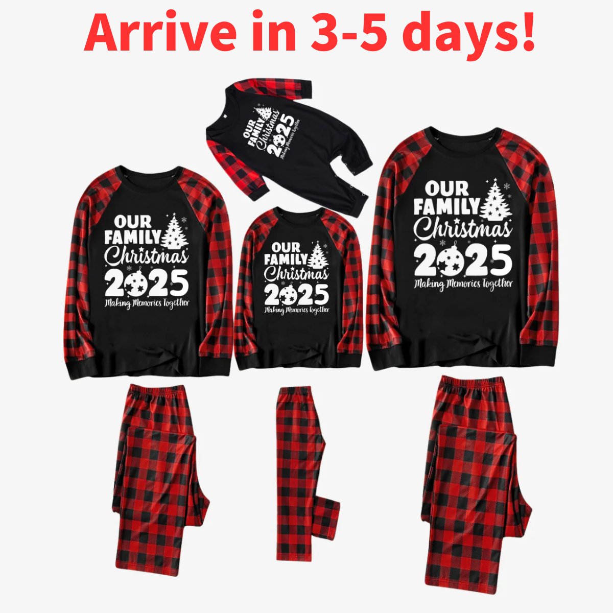 Arrive in 3-5 days - Christmas Tree & "2025 Making Memories Together" Patterned Contrast top and Black & Red Plaid Pants Family Matching Pajamas Set