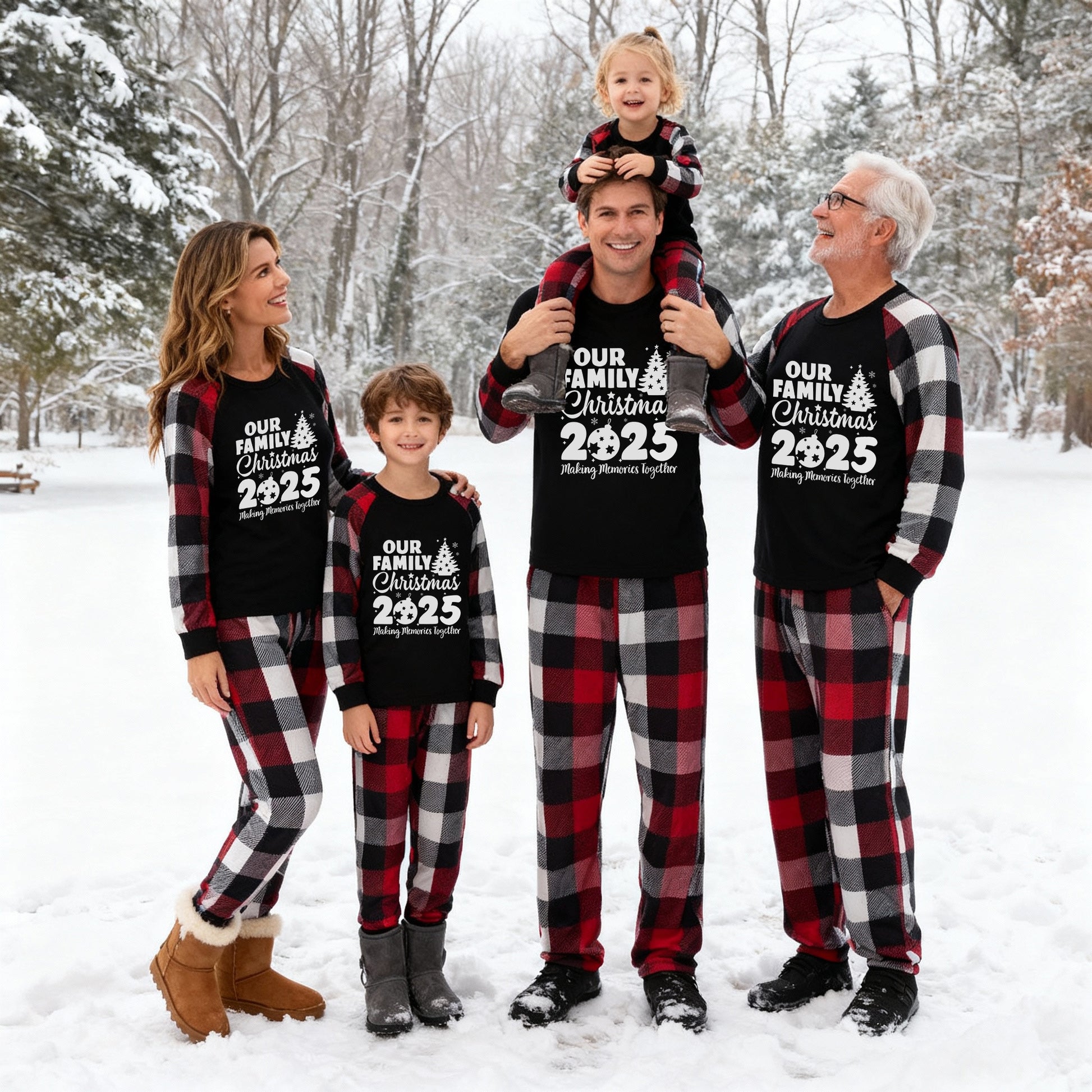 Christmas Tree & "2025 Making Memories Together" Patterned Plaid Sleeve Contrast Tops and Red & Black & White Plaid Pants Family Matching Pajamas Set With Dog Bandana