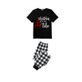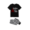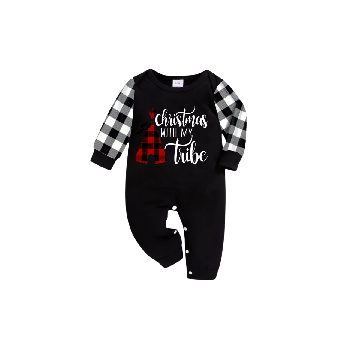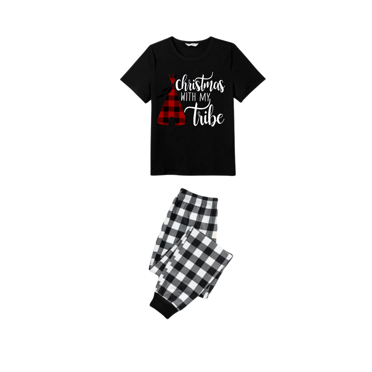Christmas With My Tribe Family Christmas Pajamas Set - Black Top Black and White Plaid Pants White Text Graphic