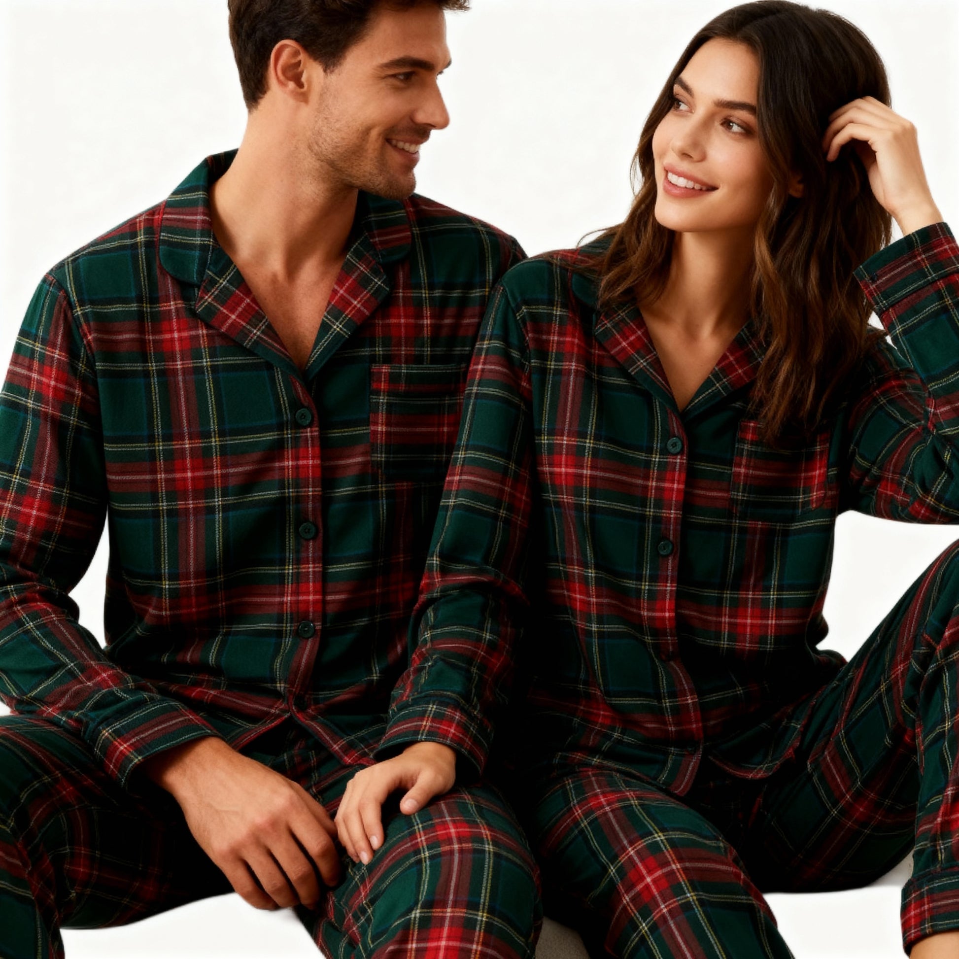 Couple Green Red Plaid Button-Front Pajamas Sets