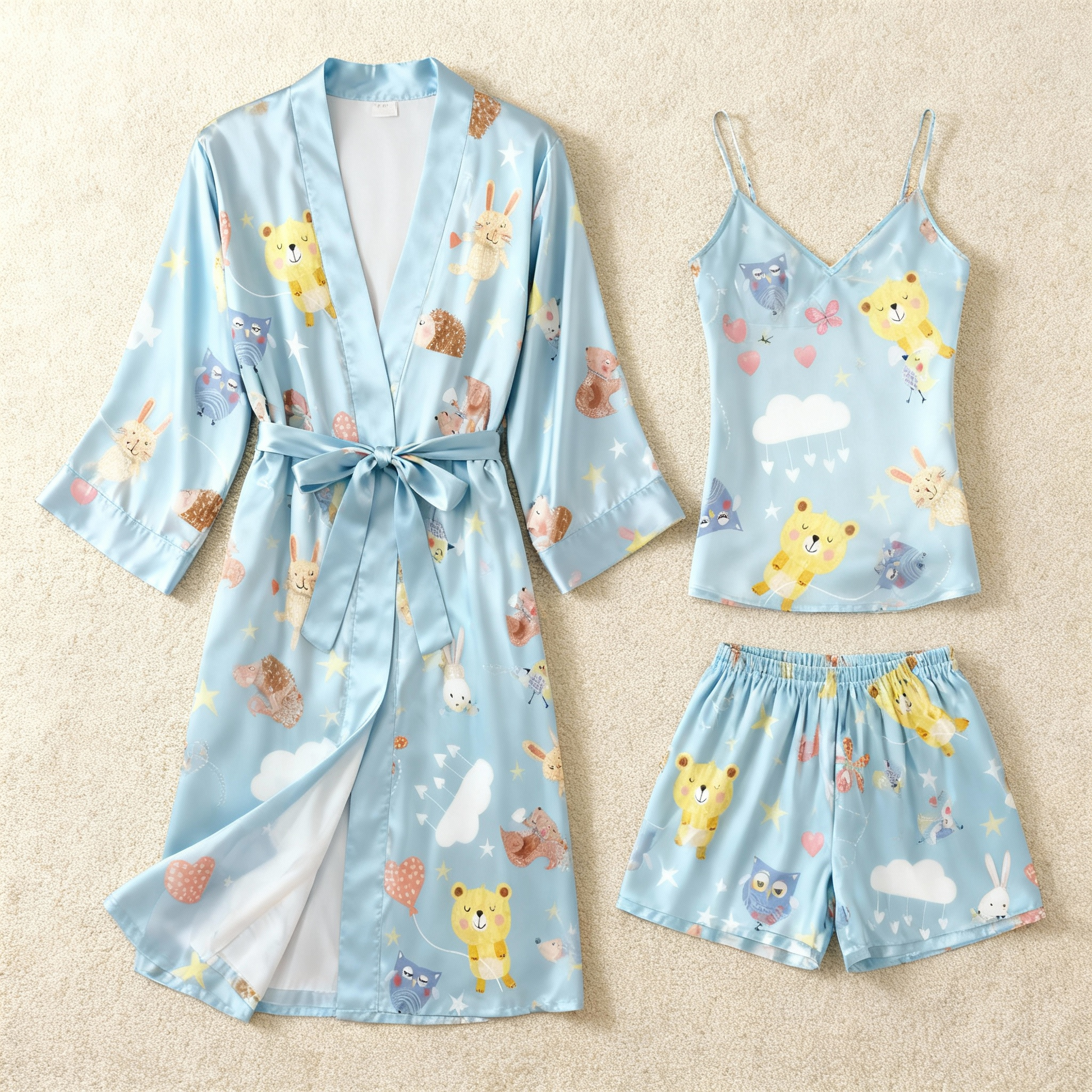 Elegant Satin Loungewear Trio with Adorable Animal Motifs