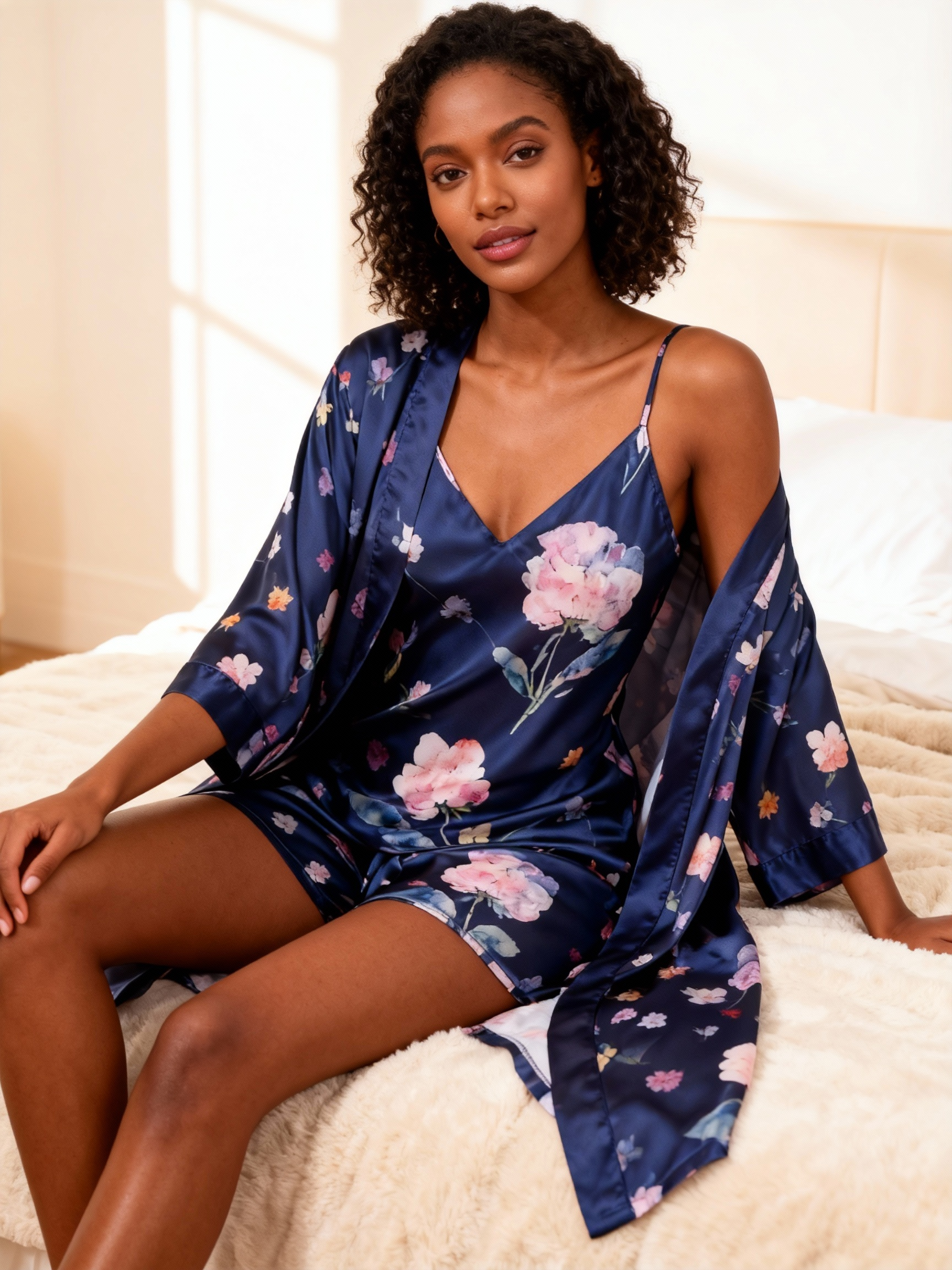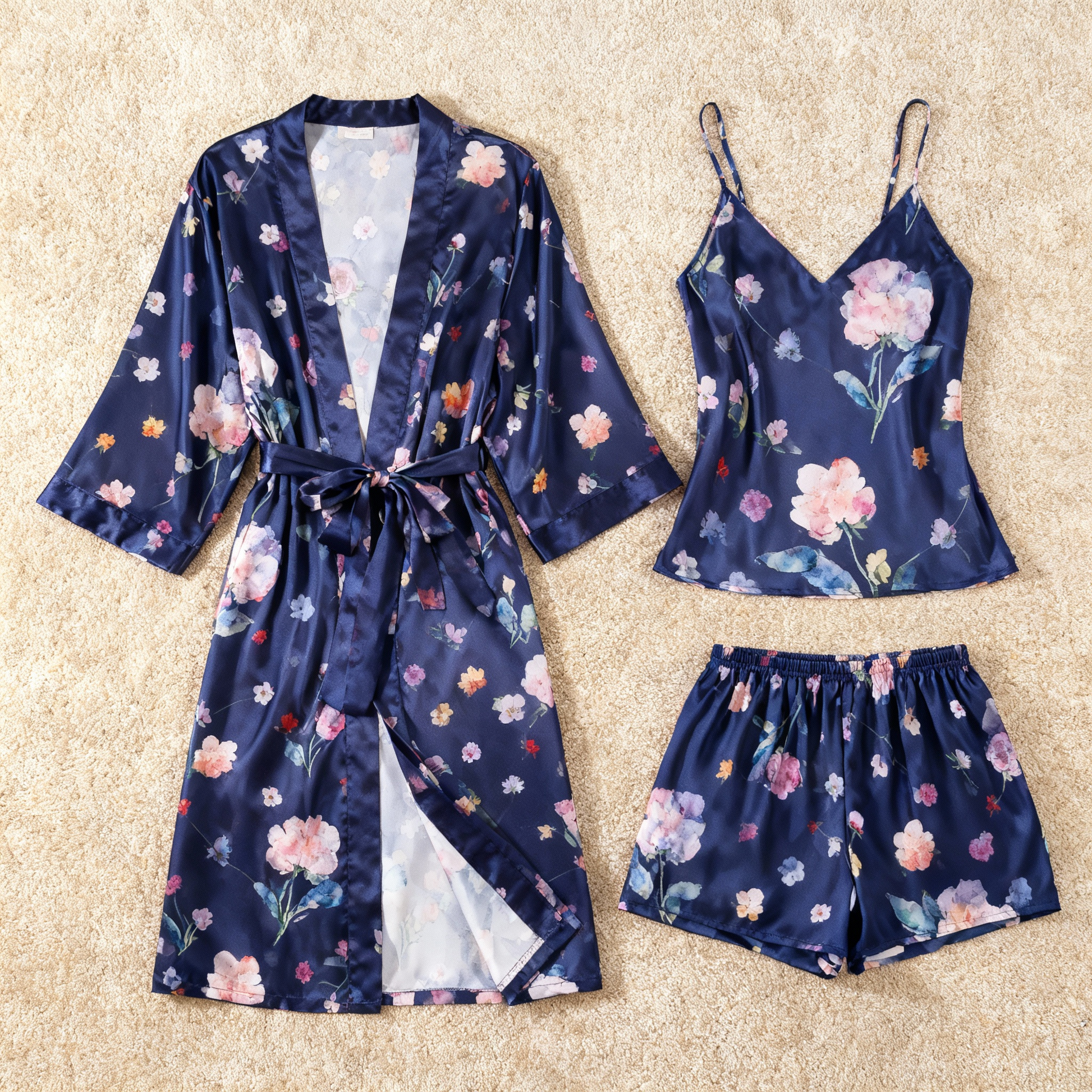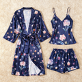 Elegant Satin Loungewear Trio with Watercolor Floral Motifs