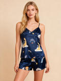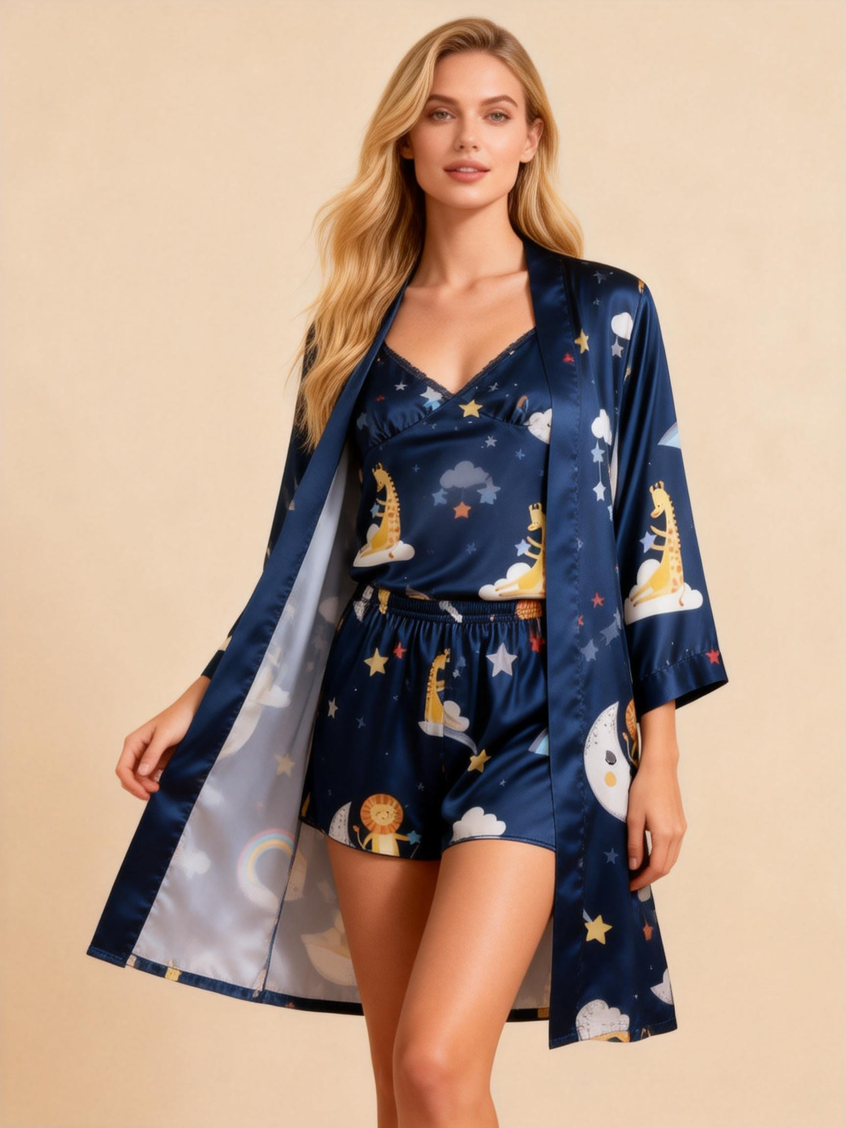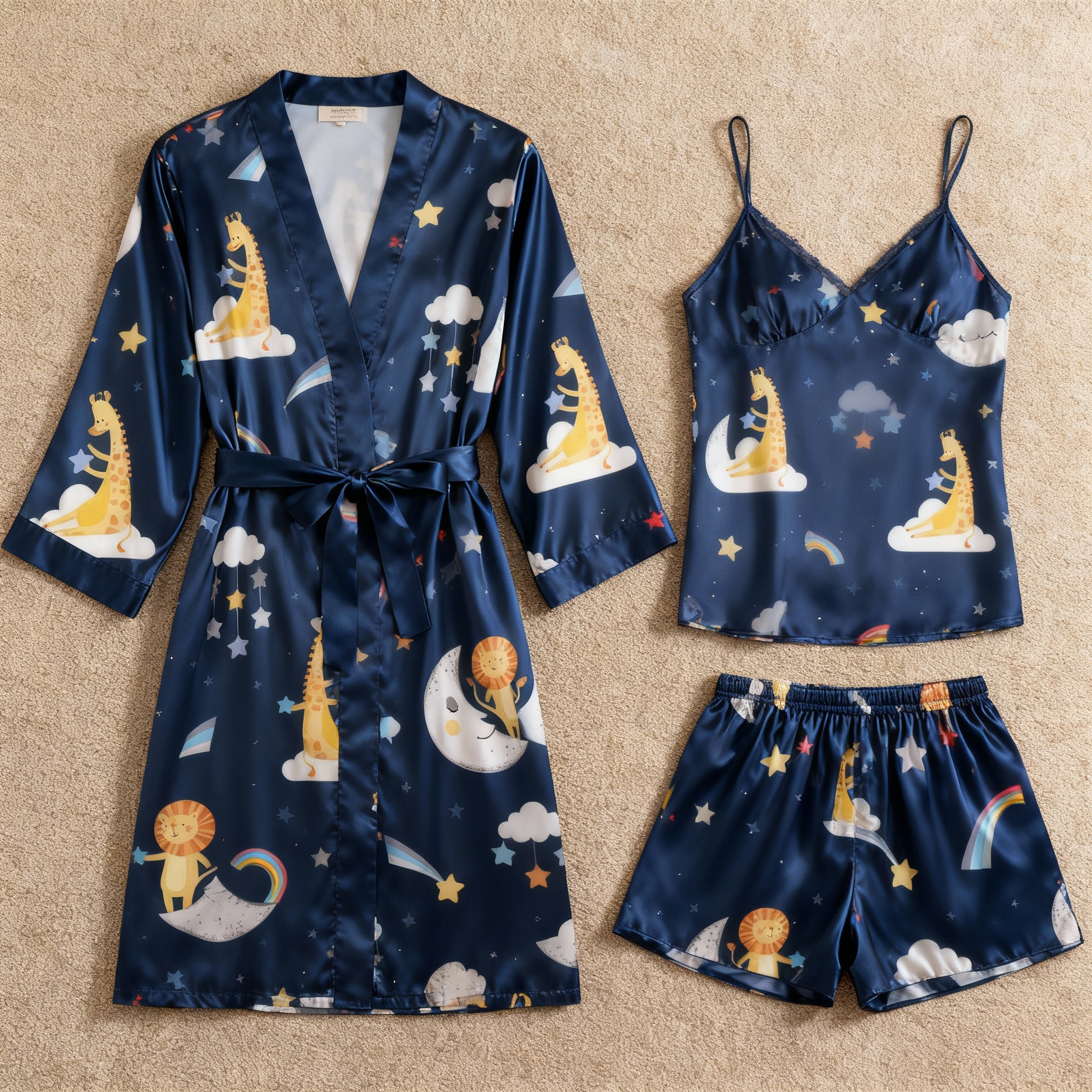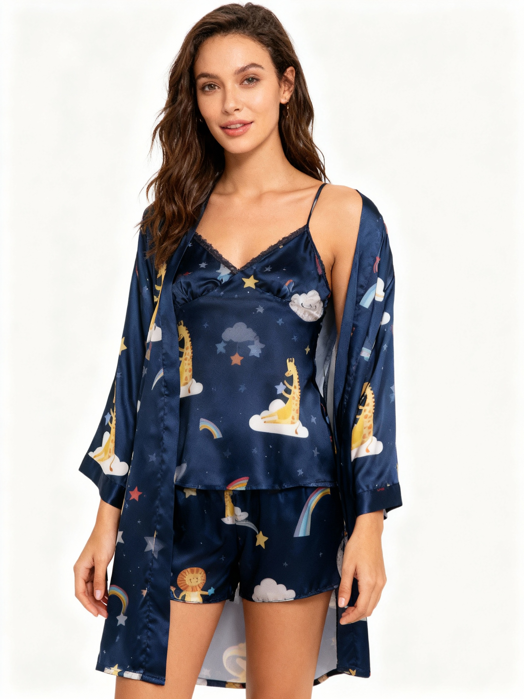 Elegant Satin Navy Loungewear Trio with Lovely Animals Motif