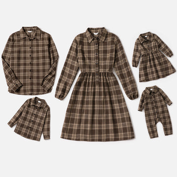 Family Matching Brown Plaid Print Long-sleeve Family Dresses and Shirts Sets