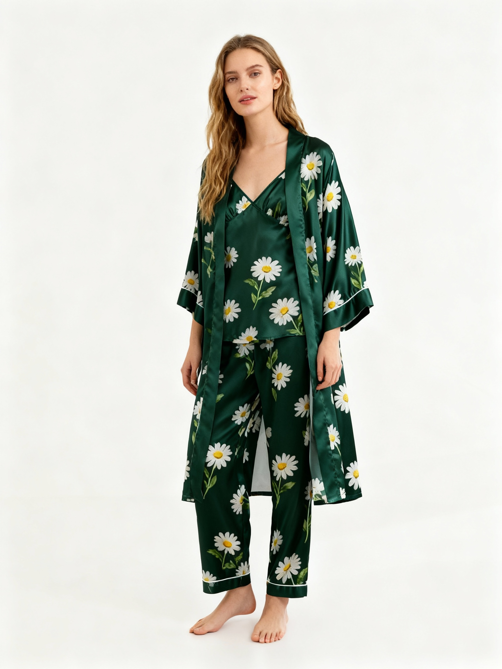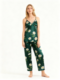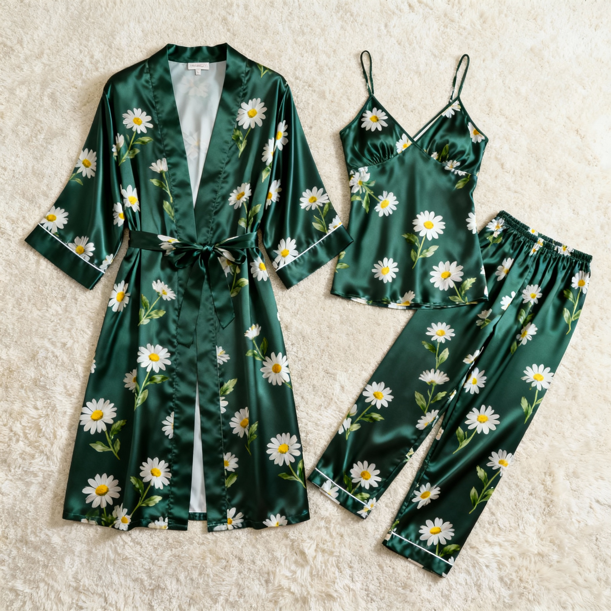 Feminine Elegant Green Satin Pajama Trio