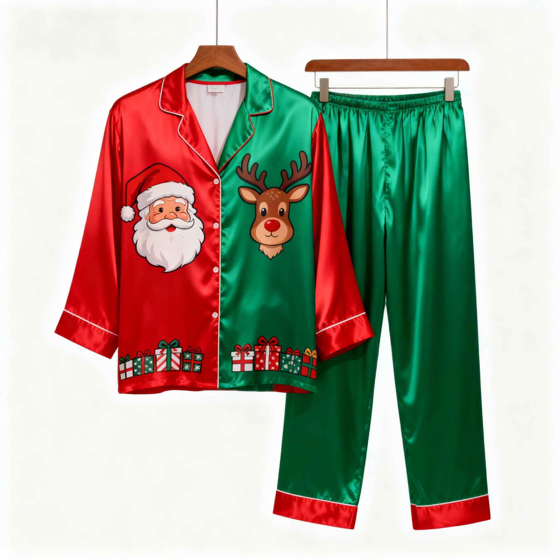 Holiday Couple Santa Claus Button-Up Satin Christmas Pajamas Set