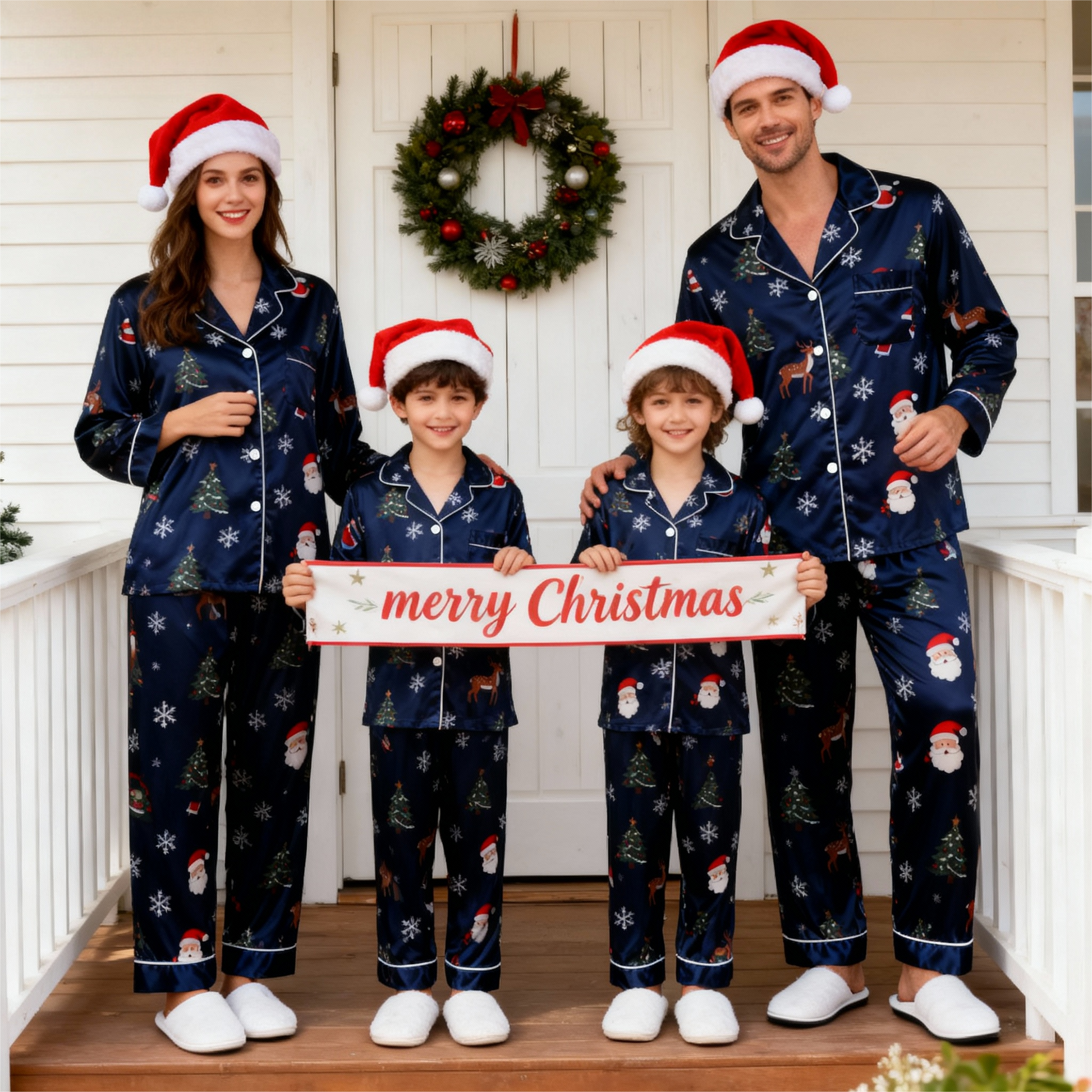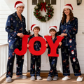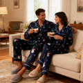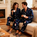 Holiday Family Button-Up Navy Blue Satin Christmas Pajamas Set