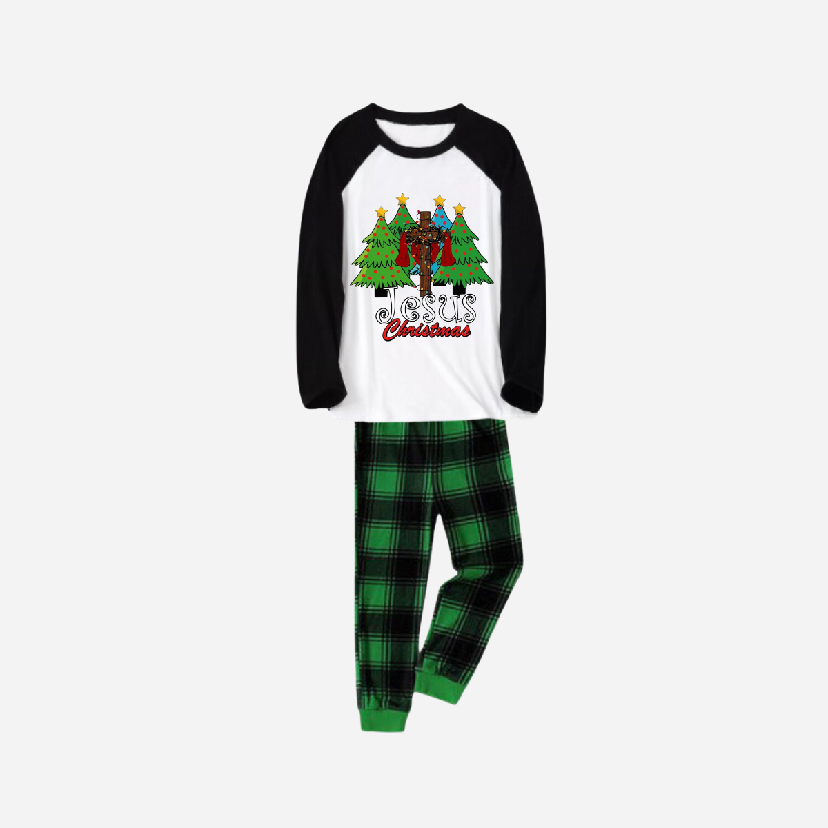 Jesus Christmas Family Matching Pajamas Set - Black and White Top with Green Plaid Pants