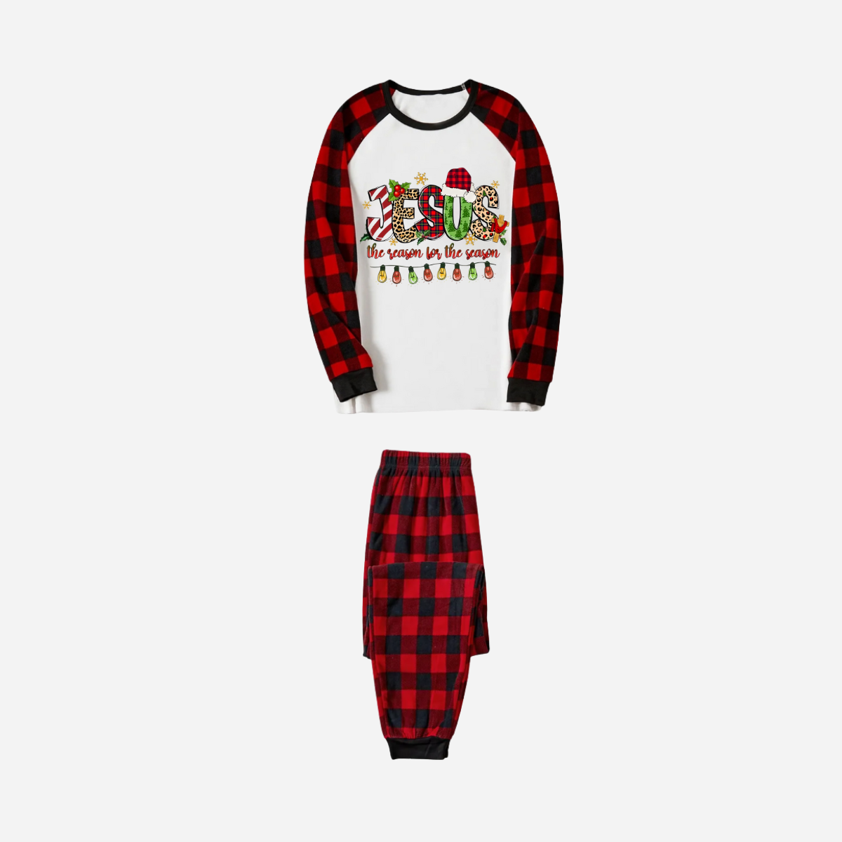 Jesus the Reason for the Season Family Christmas Pajamas Set - White Top with Red Plaid Sleeves and Pants
