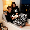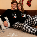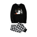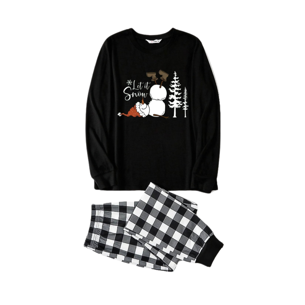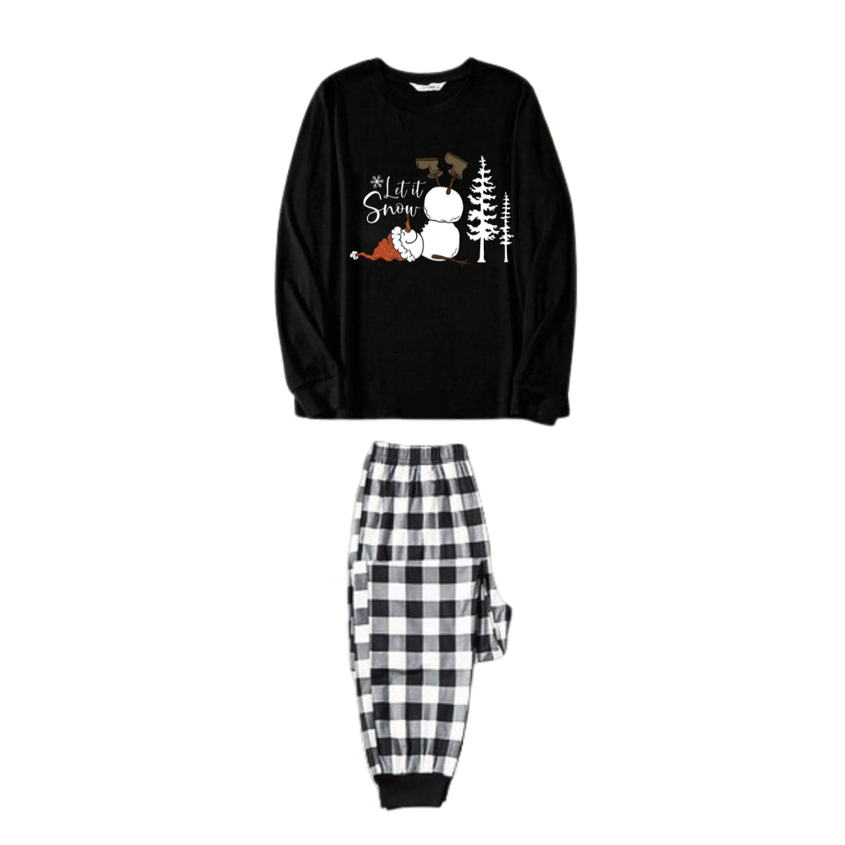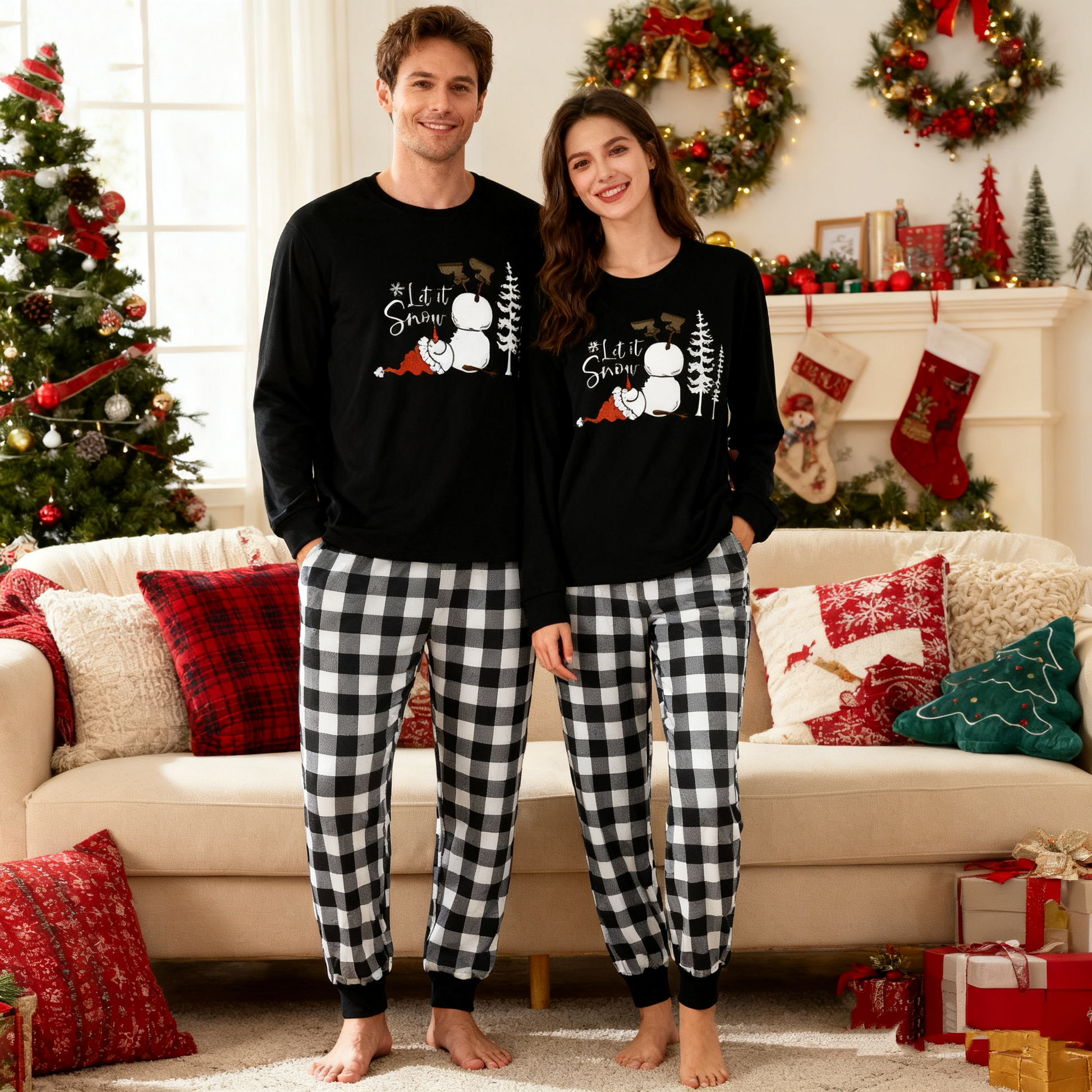 Couple Black and White Plaid Matching Pajamas "Let it Snow" Text and Snowman Prints