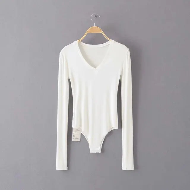 Long Sleeve Deep V-Neck White Bodysuit Knitted Bodycon