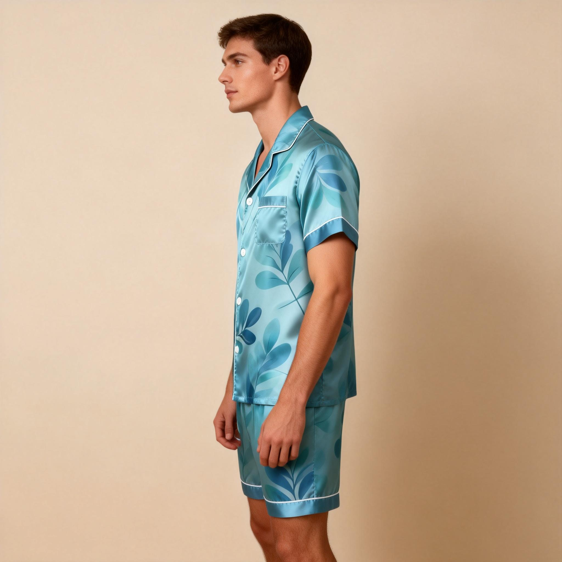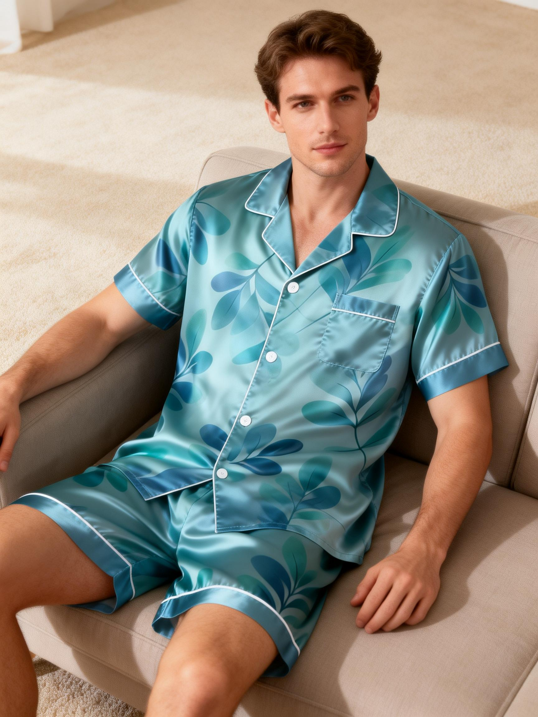 For Him: A lapel collar button-up short-sleeve top and shorts.