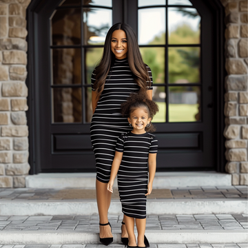 Make a fashion statement with this adorable set of matching striped ribbed knit bodycon short sleeve dresses for mom and daughter. These dresses are crafted from high-quality ribbed knit fabric, ensuring both comfort and style. Whether you're heading out for a day of fun or a special occasion, these matching outfits will keep you and your little one looking chic and coordinated. Embrace the twinning trend with these stylish dresses and create unforgettable memories with your mini-me!