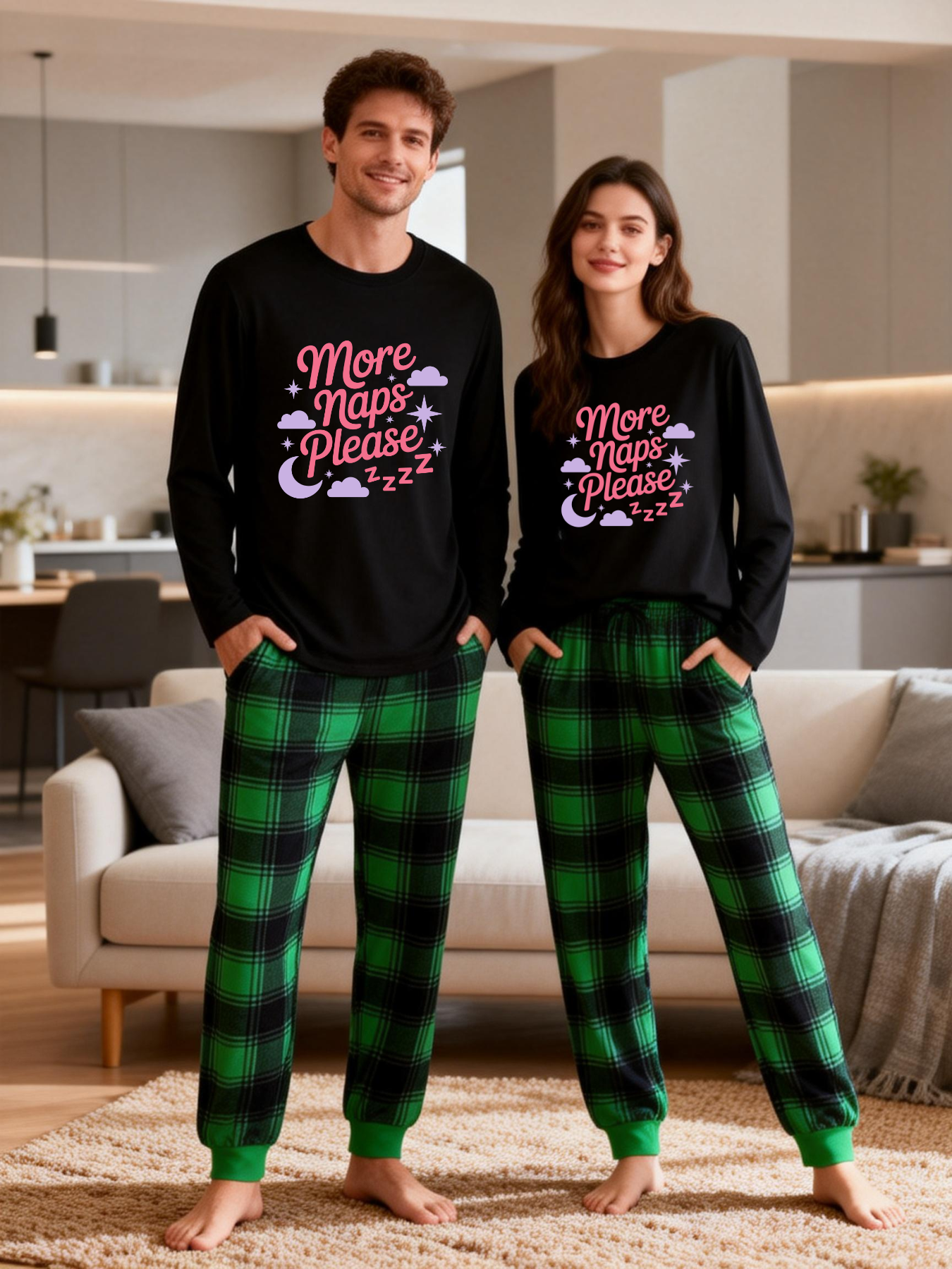 More Naps Please Letter Printed Green Black Plaid Matching Pajamas