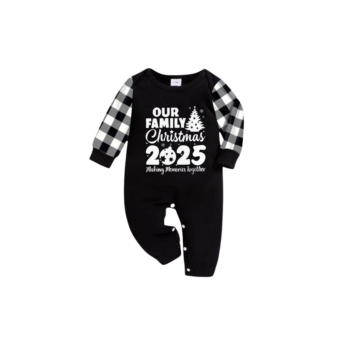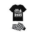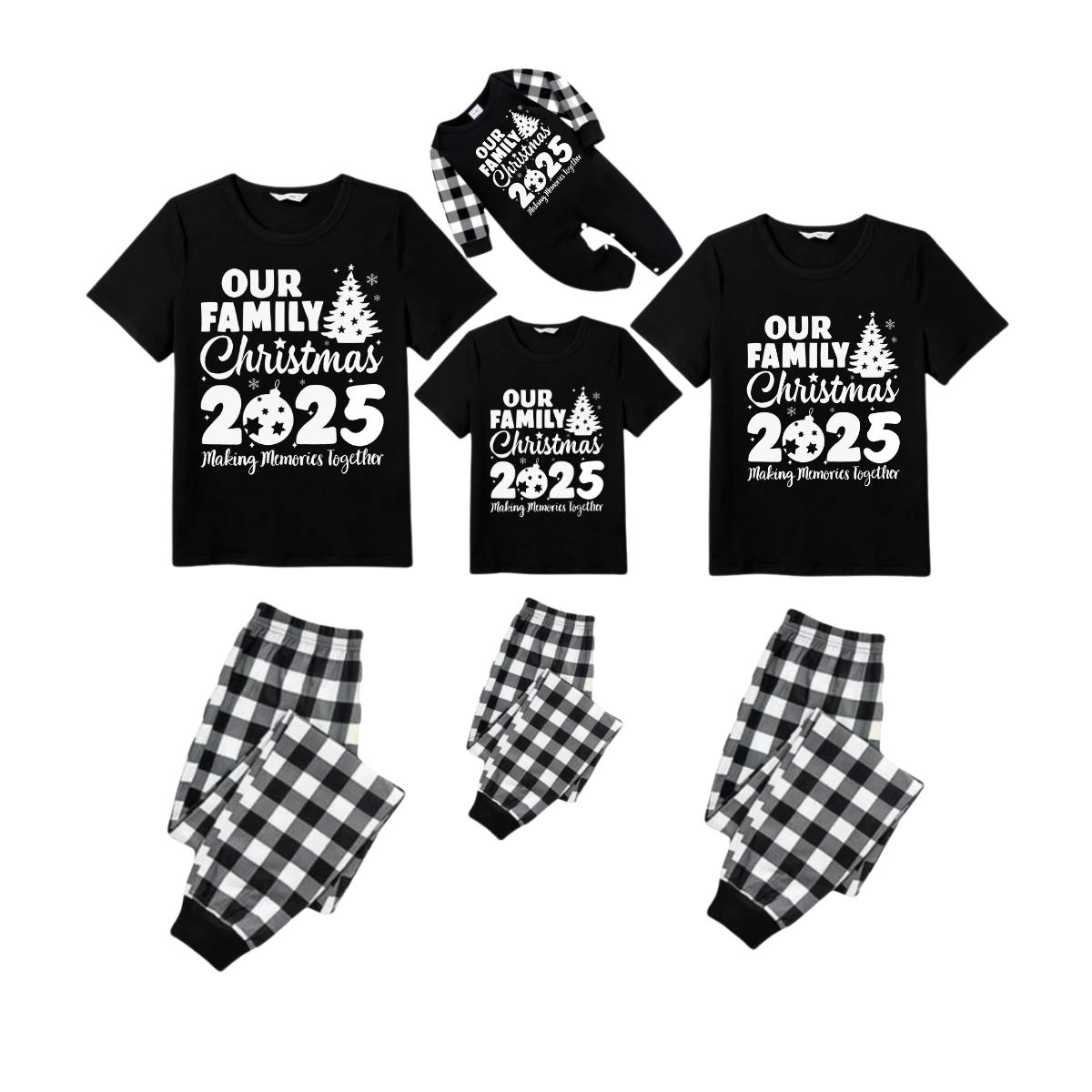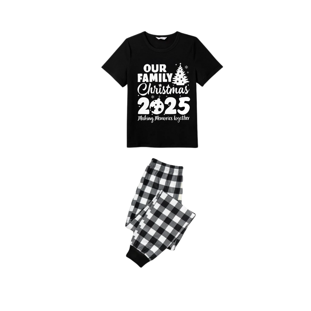 Our Family Christmas 2025 Pajamas Set - Black Top Black and White Plaid Pants White Graphic Text Tree