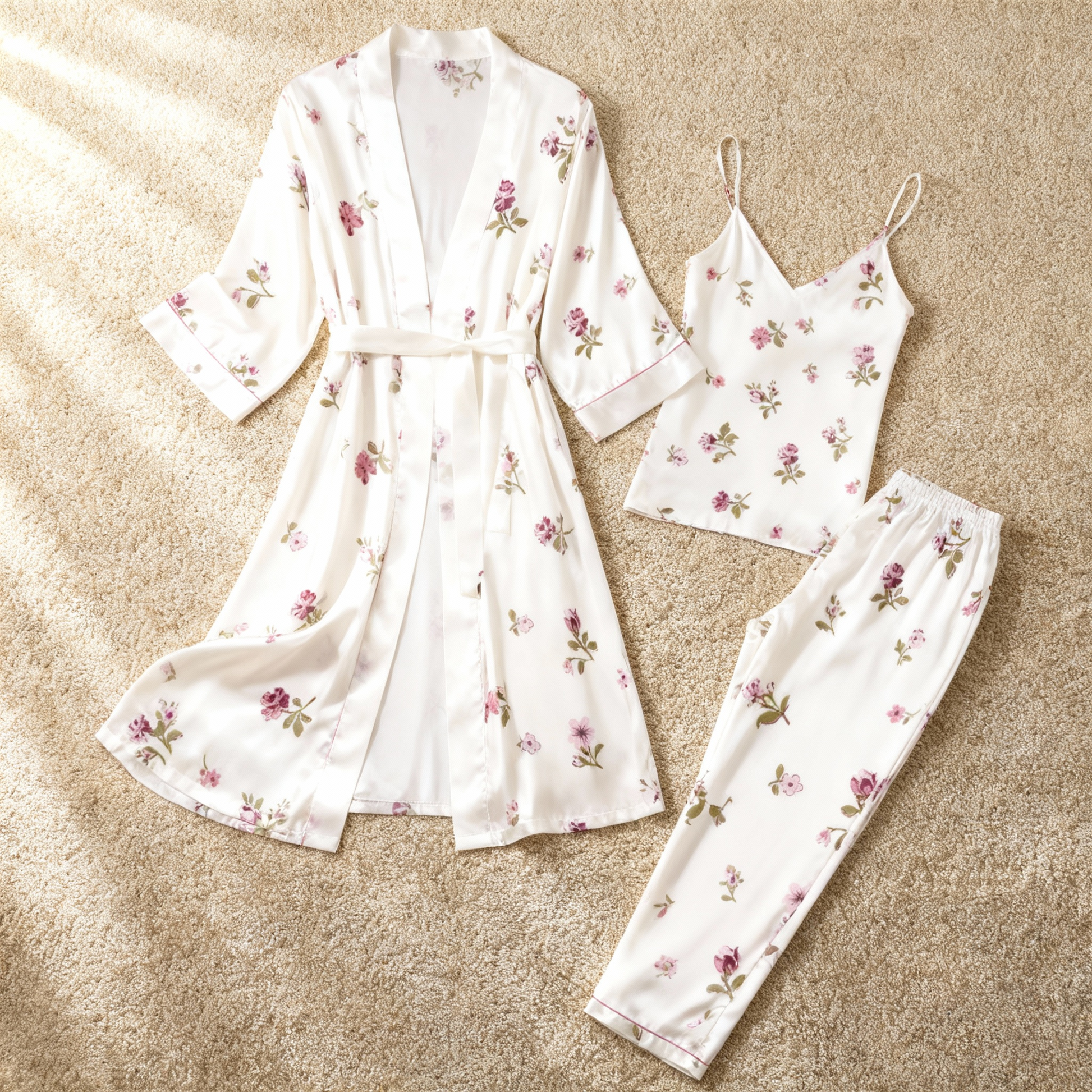 Satin 3-Piece Sleepwear Set with Elegant Botanical Print