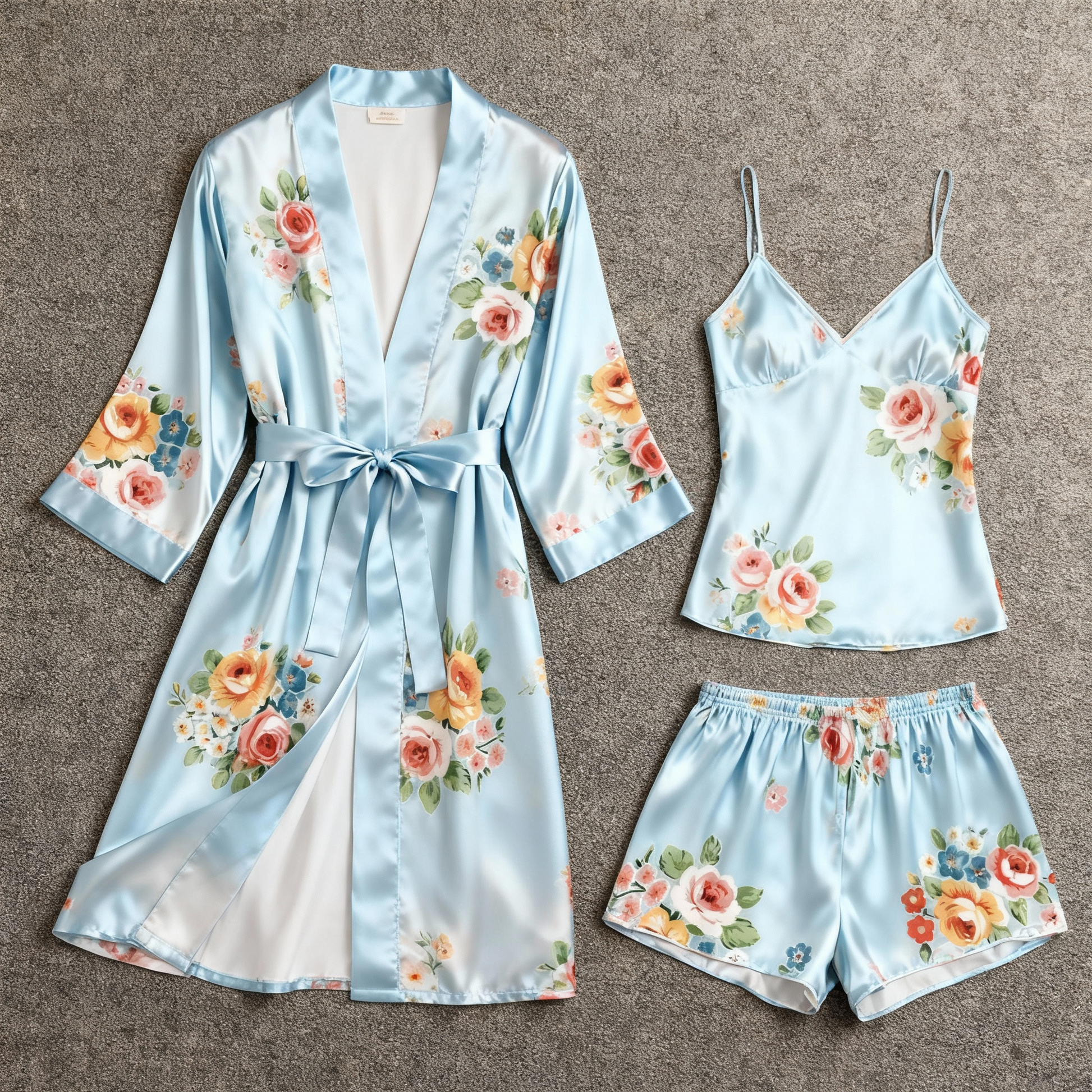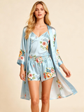Satin Nightwear Set for Women – Elegant Floral Robe, Cami, and Shorts
