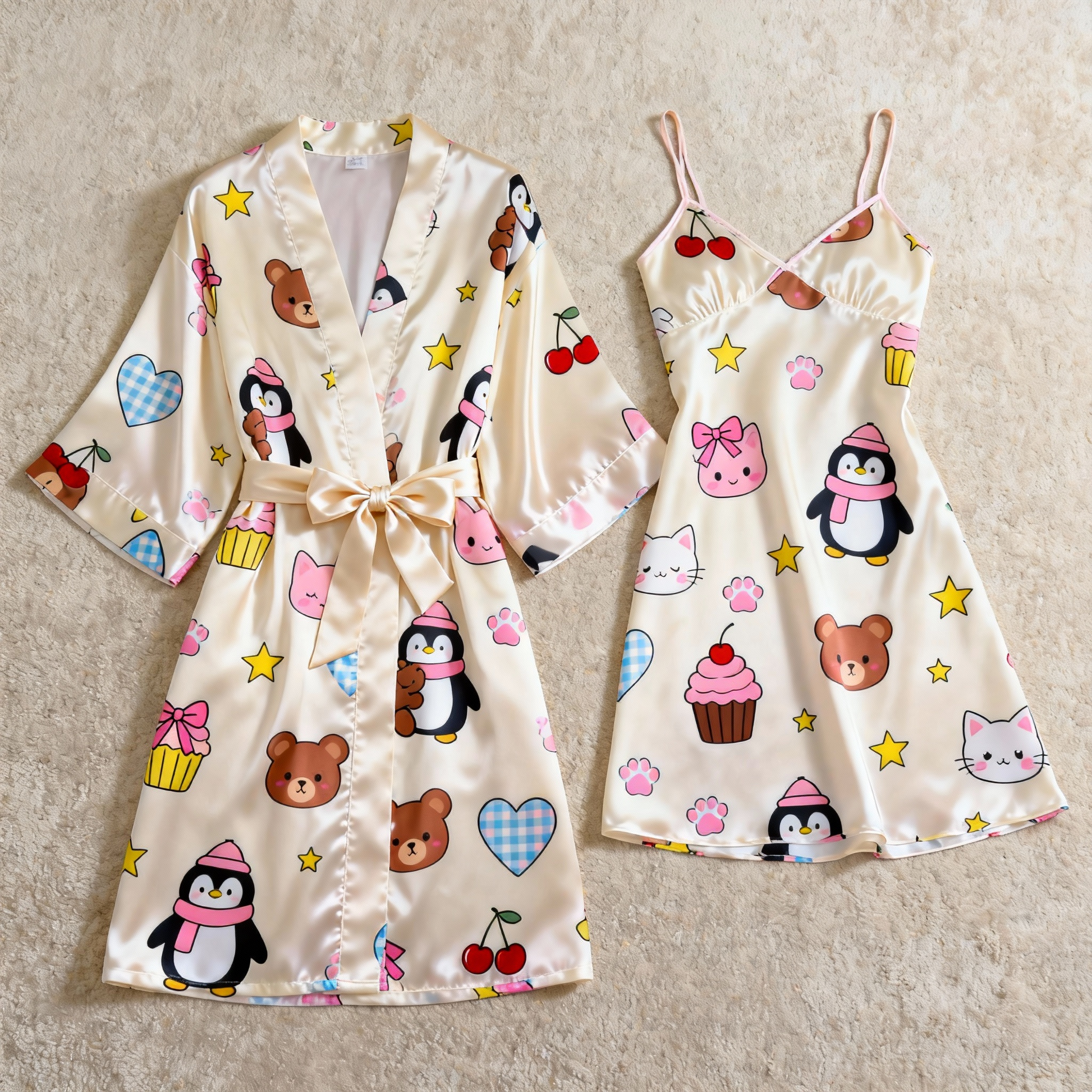Satin Robe & Nightgown Set - Cartoon Pattern Printed