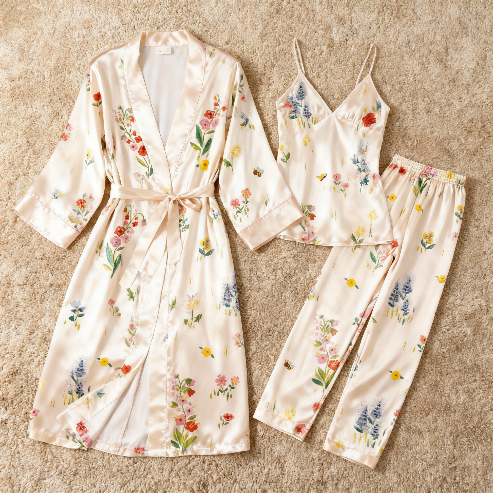 Silky Satin 3-Piece Nightwear Set with Colorful Florals Design