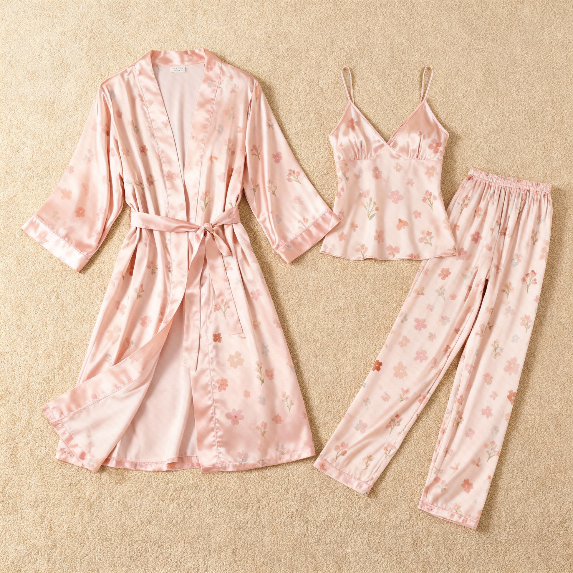Silky Satin 3-Piece Pink Nightwear Set with Florals Design
