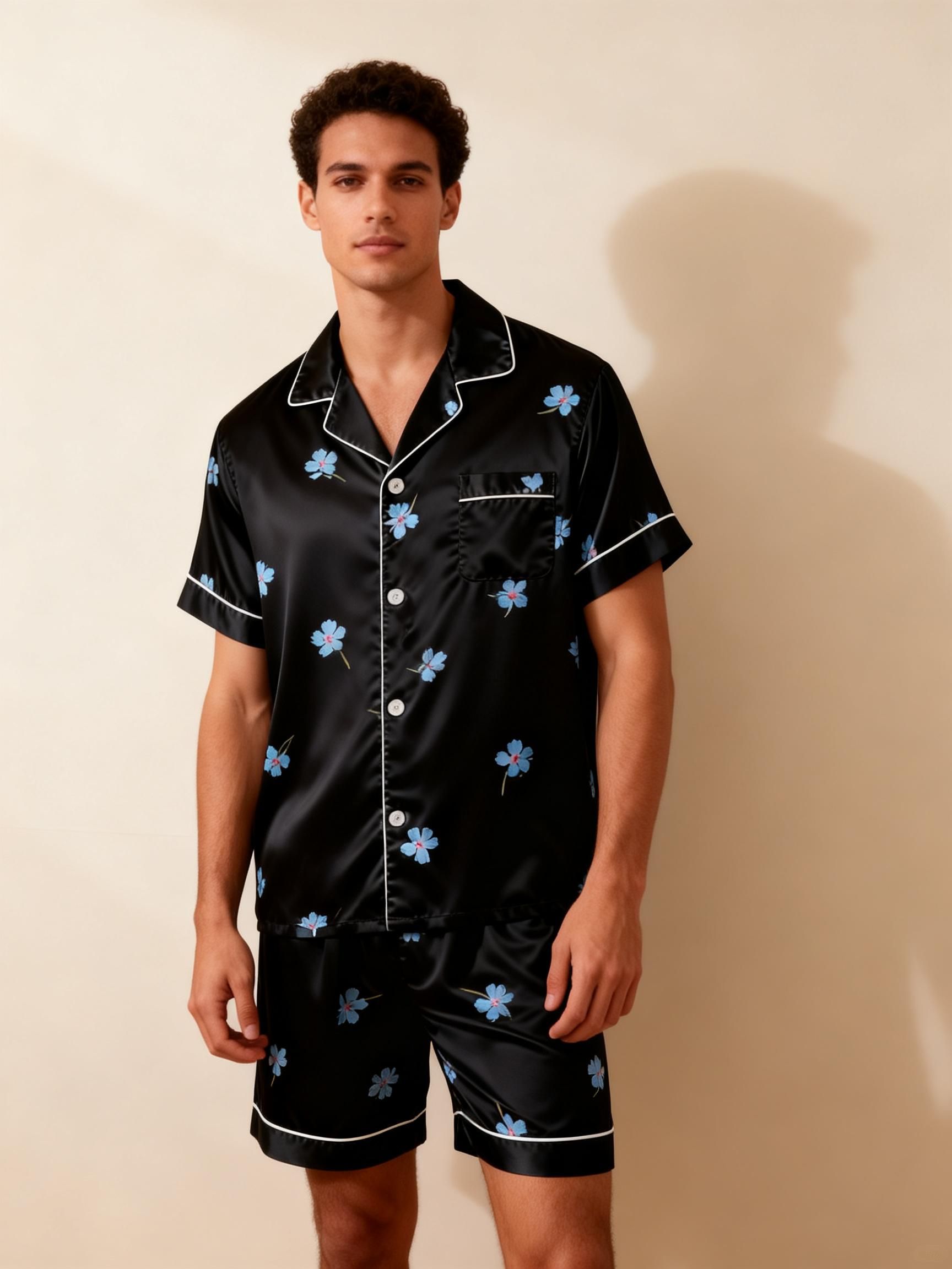 For Him: A lapel collar button-up short-sleeve top and shorts.