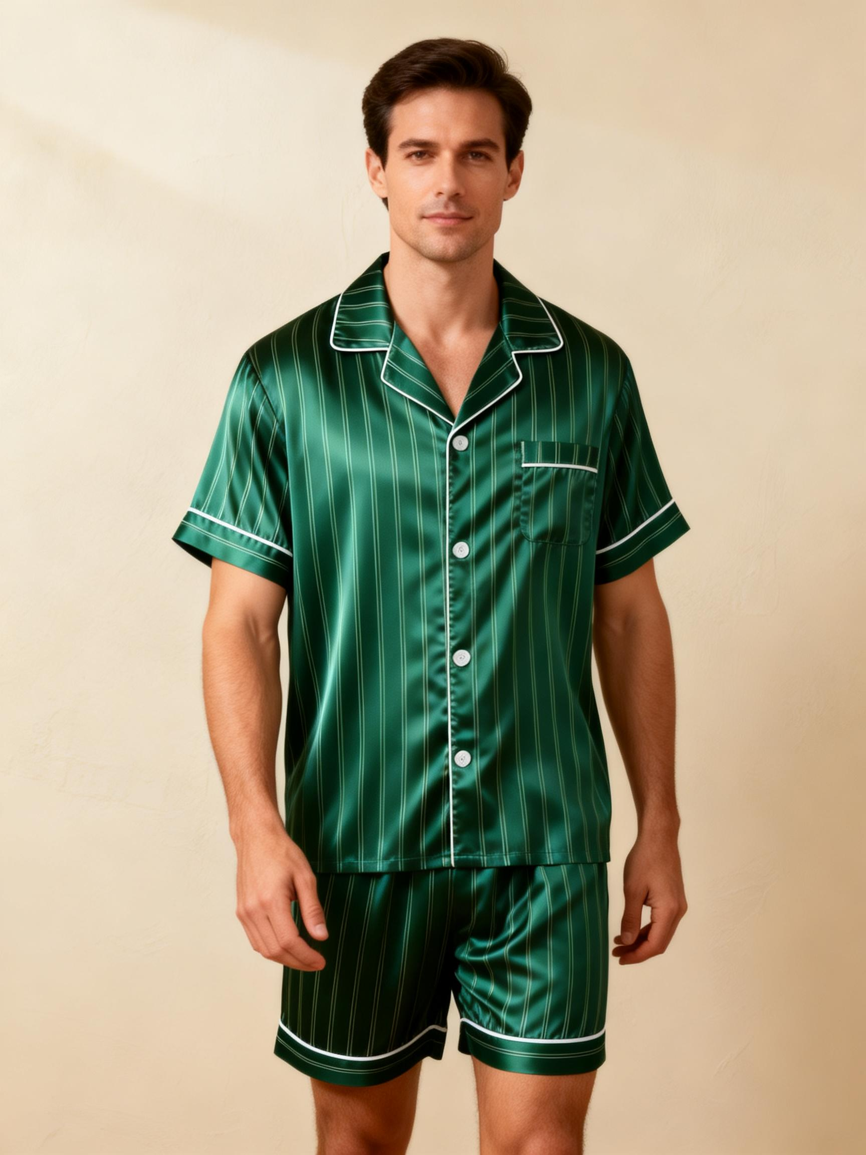 Silky Satin Striped Printed Sleep Set for Couples-Forest Green