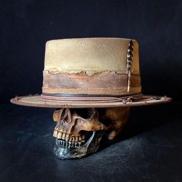 Heavily distressed hat with a two inch brim and 5 inch crown. 100% Beaver fur, western weight at 165g. Layered with distressed, tattered fabric as a band, then leather cord and leather strips. A small feather adorns the side.