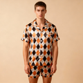 For Him: A lapel collar button-up short-sleeve top and shorts.
