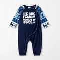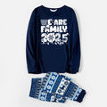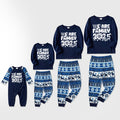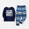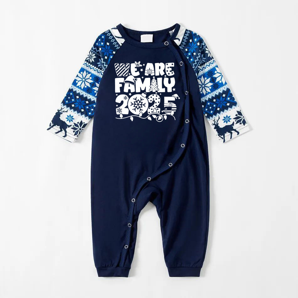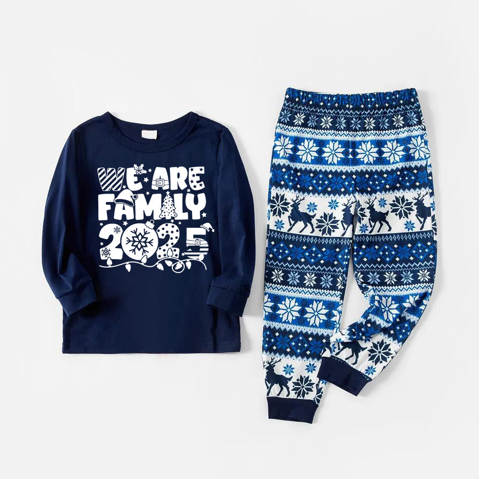 We Are Family 2025 Christmas Pajamas Set - Navy Top Blue and White Nordic Pattern Pants White Text Graphic