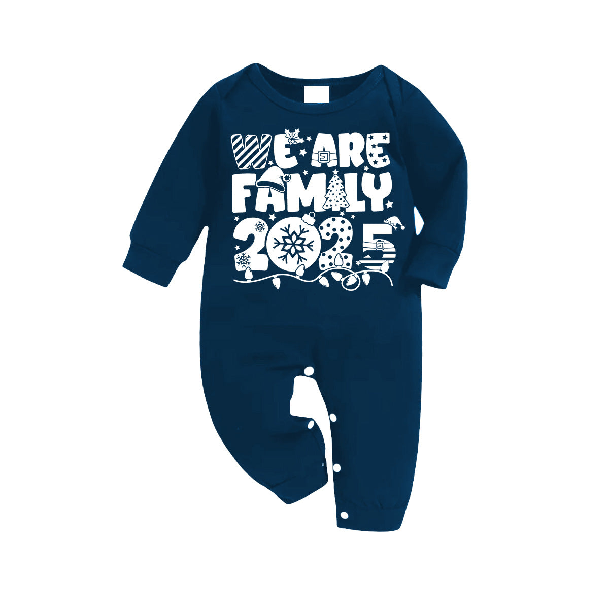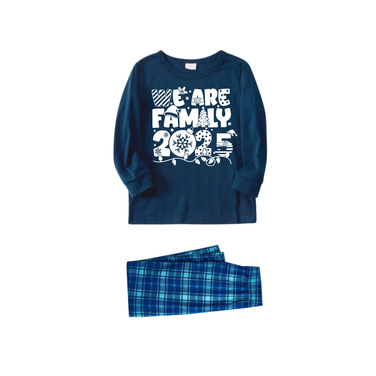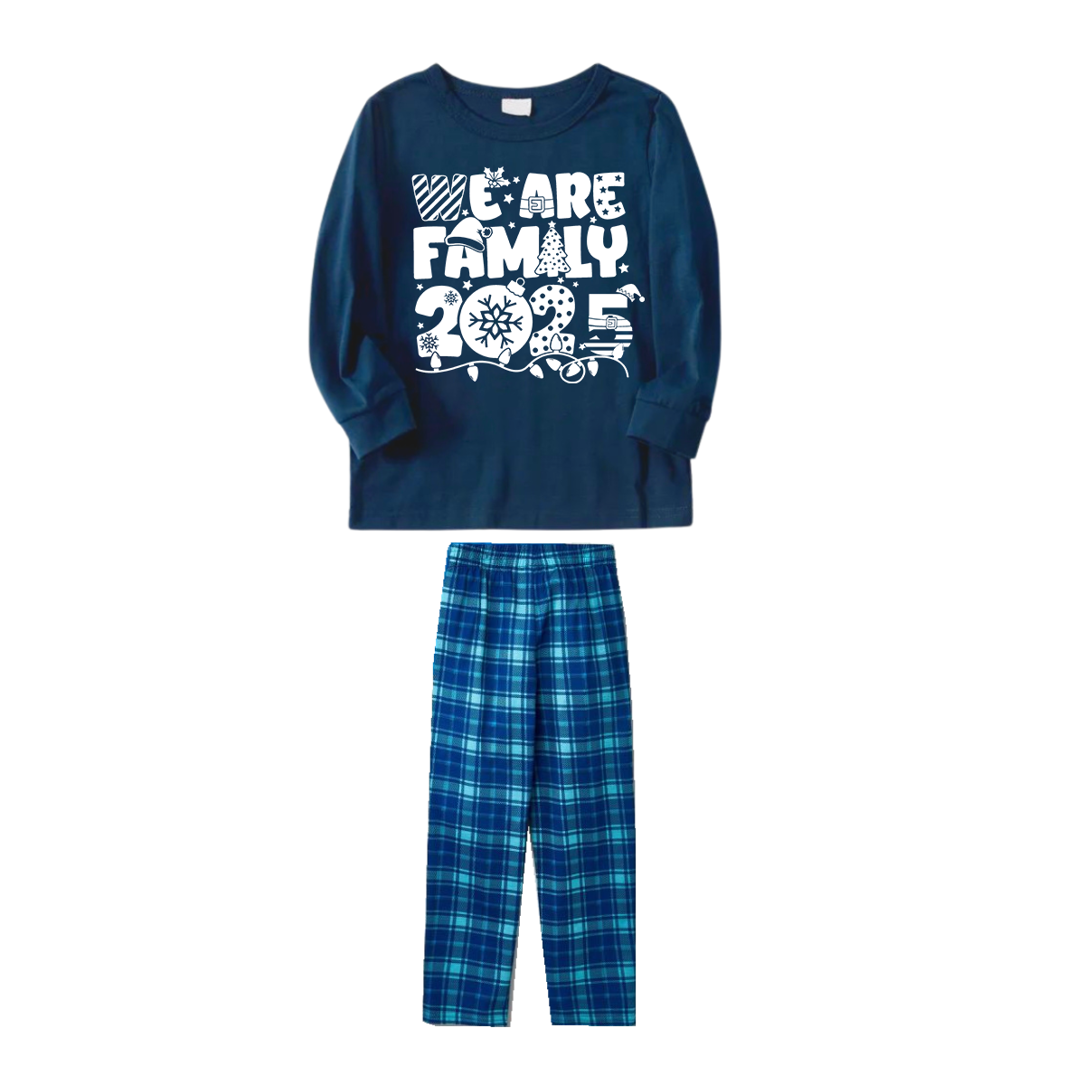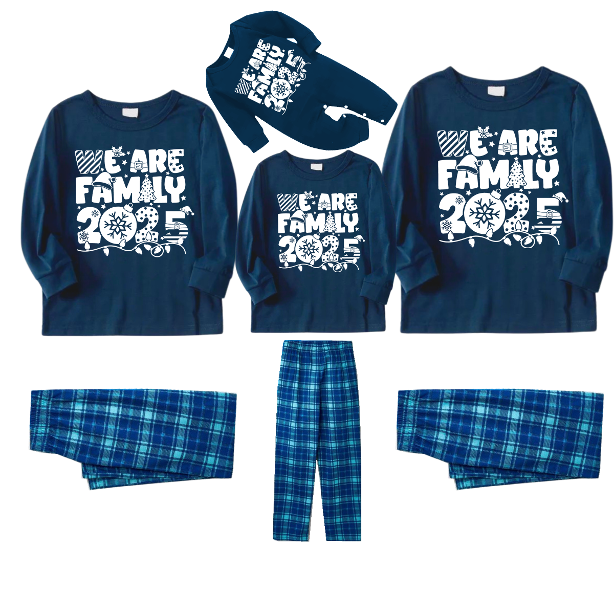 We Are Family 2025 Christmas Pajamas Set - Navy Top Blue Plaid Pants White Text Graphic