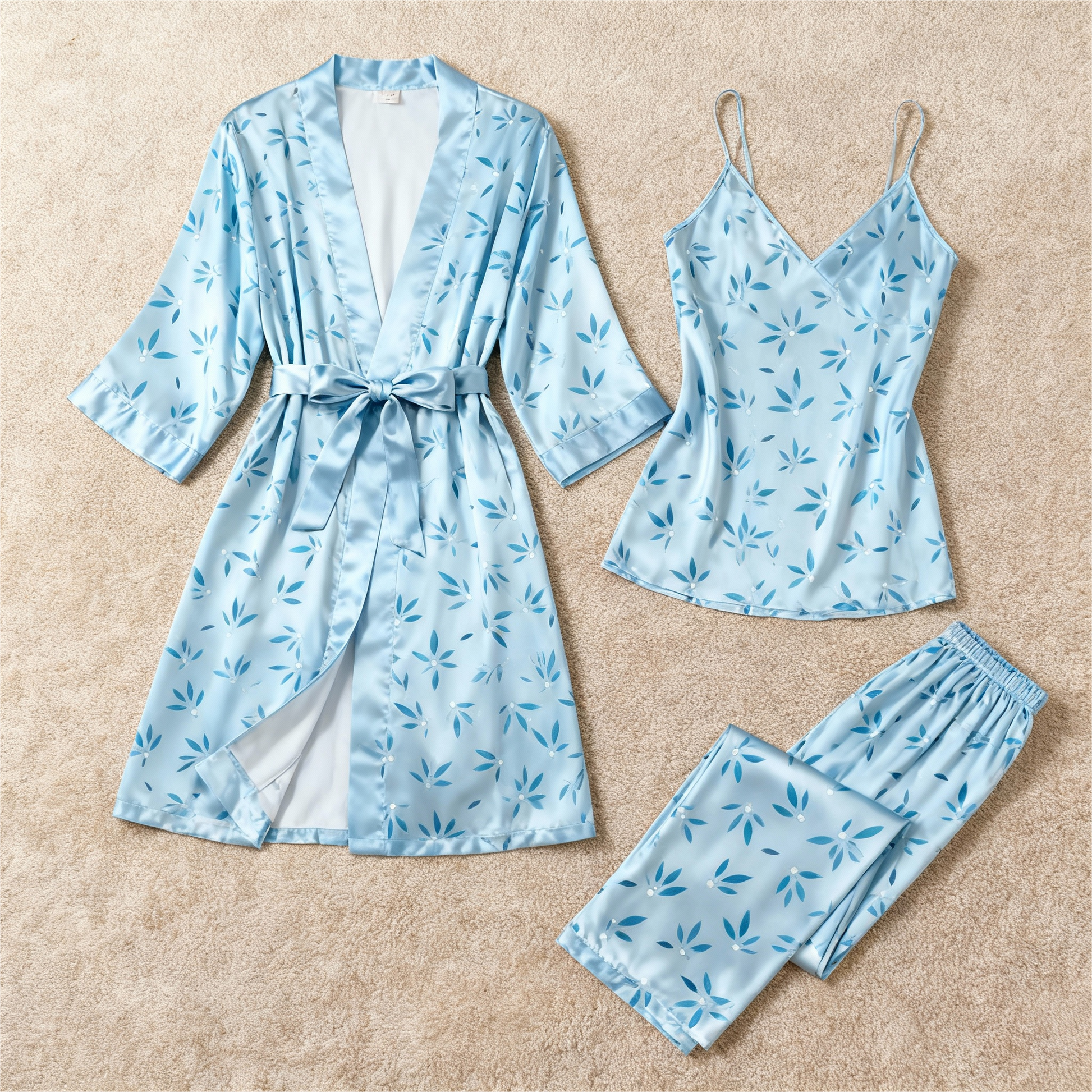Women’s Light Blue Silky Satin Homewear Set with Leaf Motifs