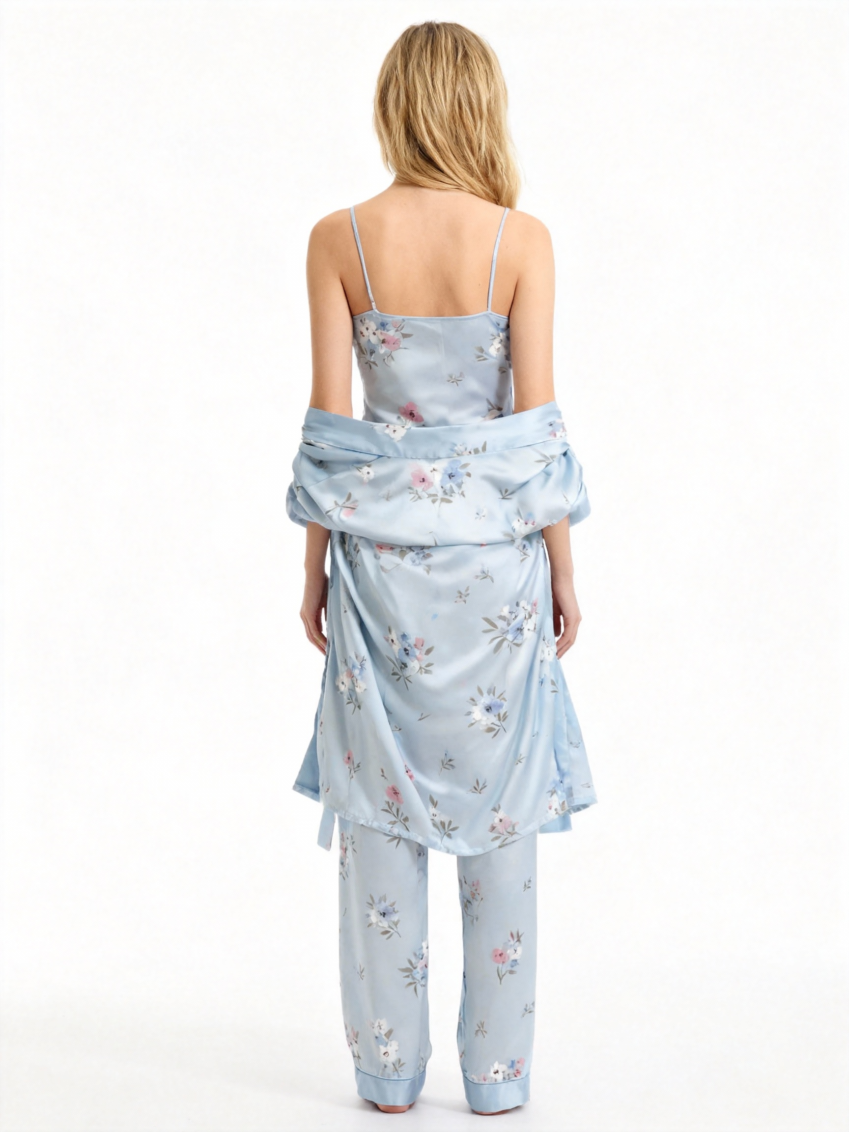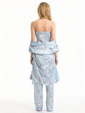 Women’s Pale Blue Silky Satin Homewear Set with Floral Illustration