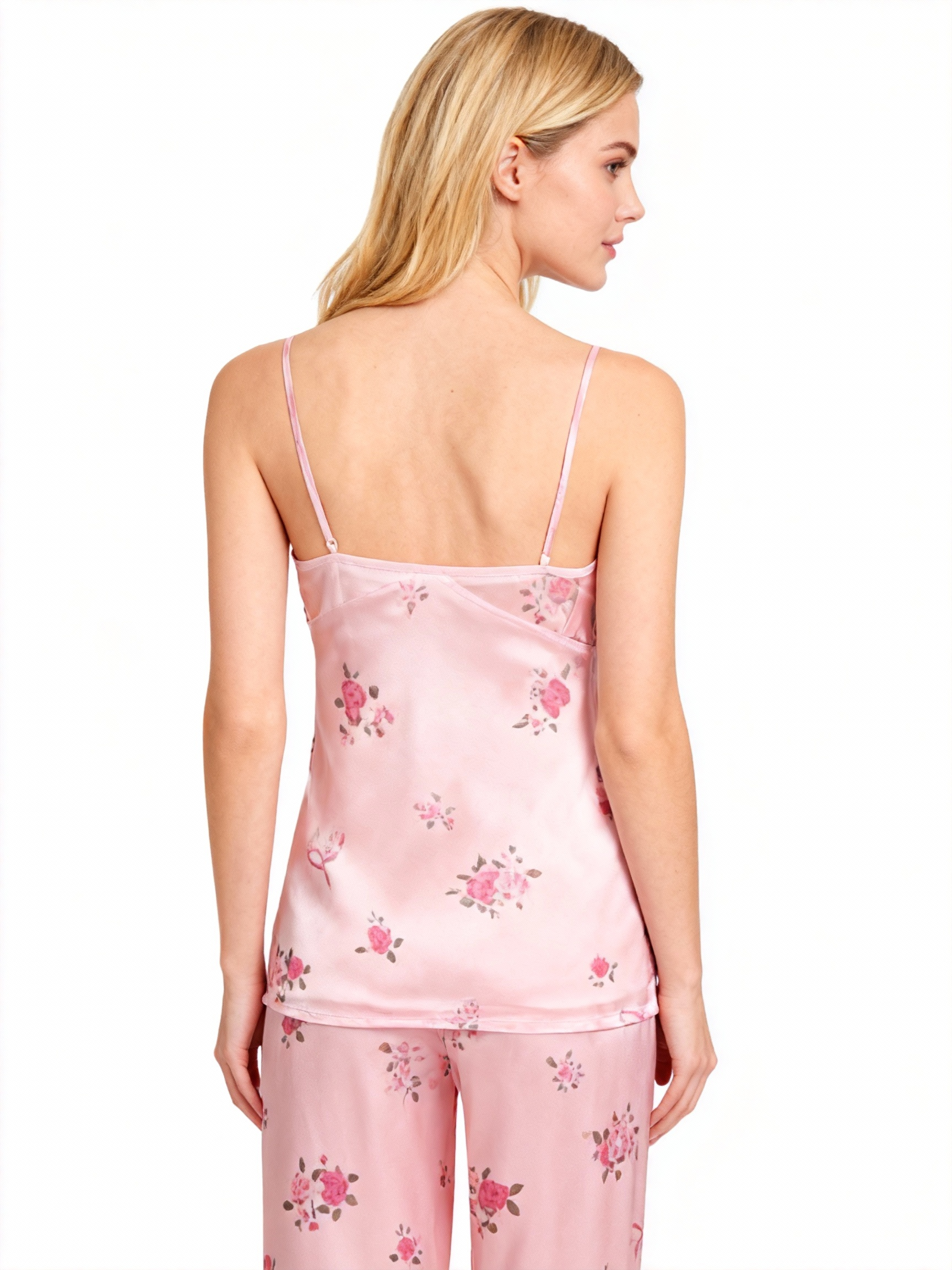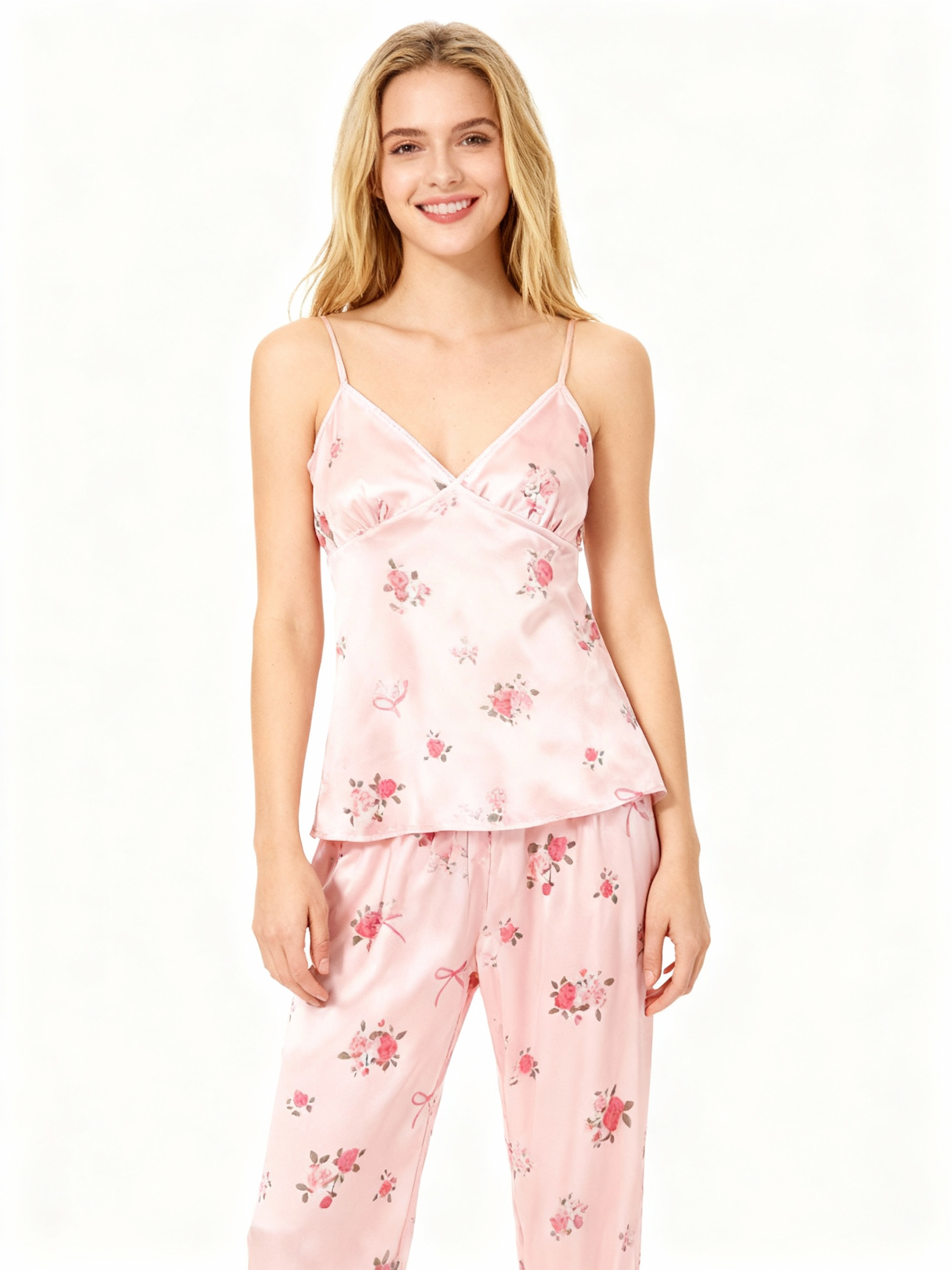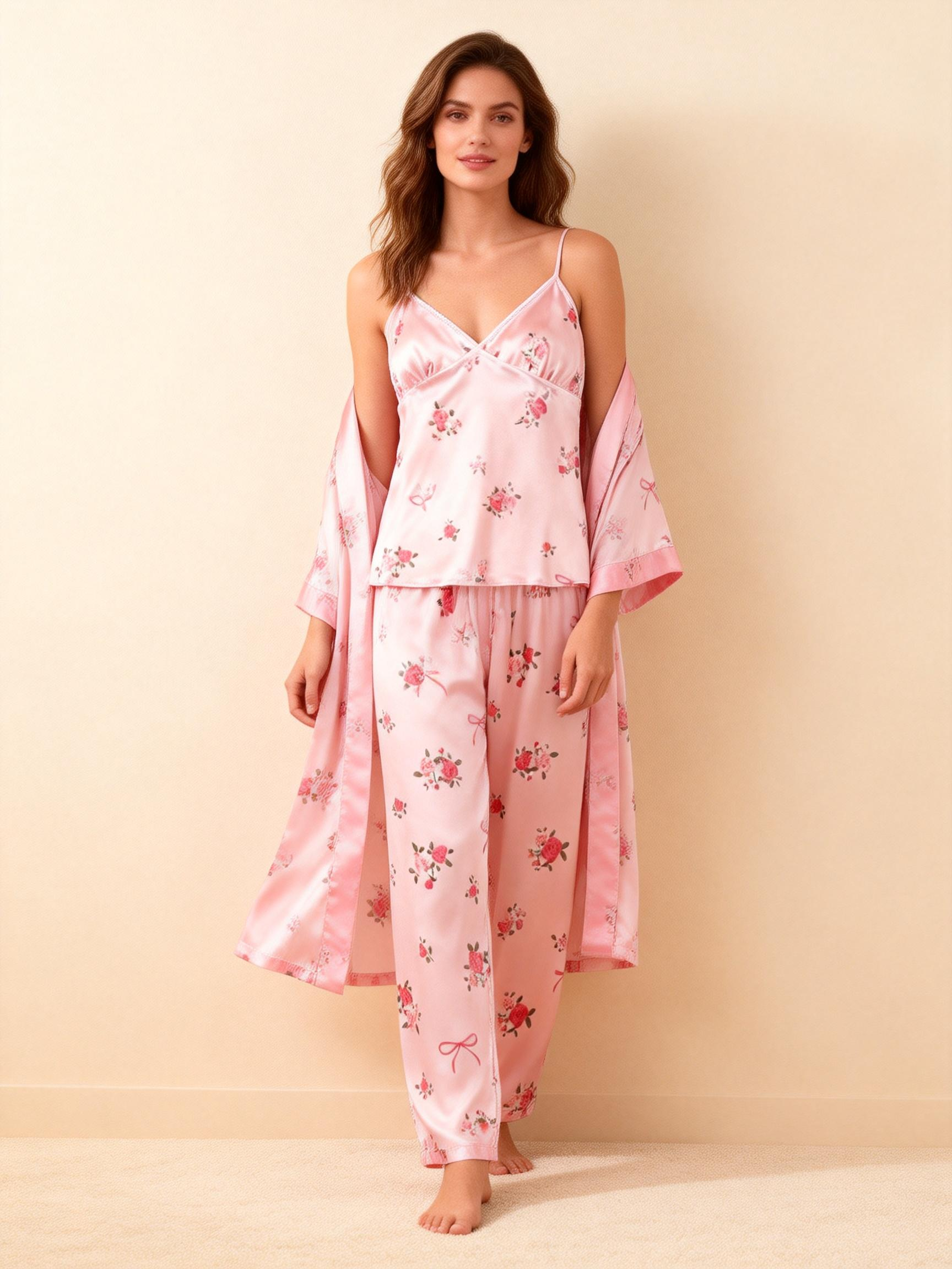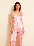 Women’s Pink Silky Satin Homewear Set with Romantic Floral Motifs