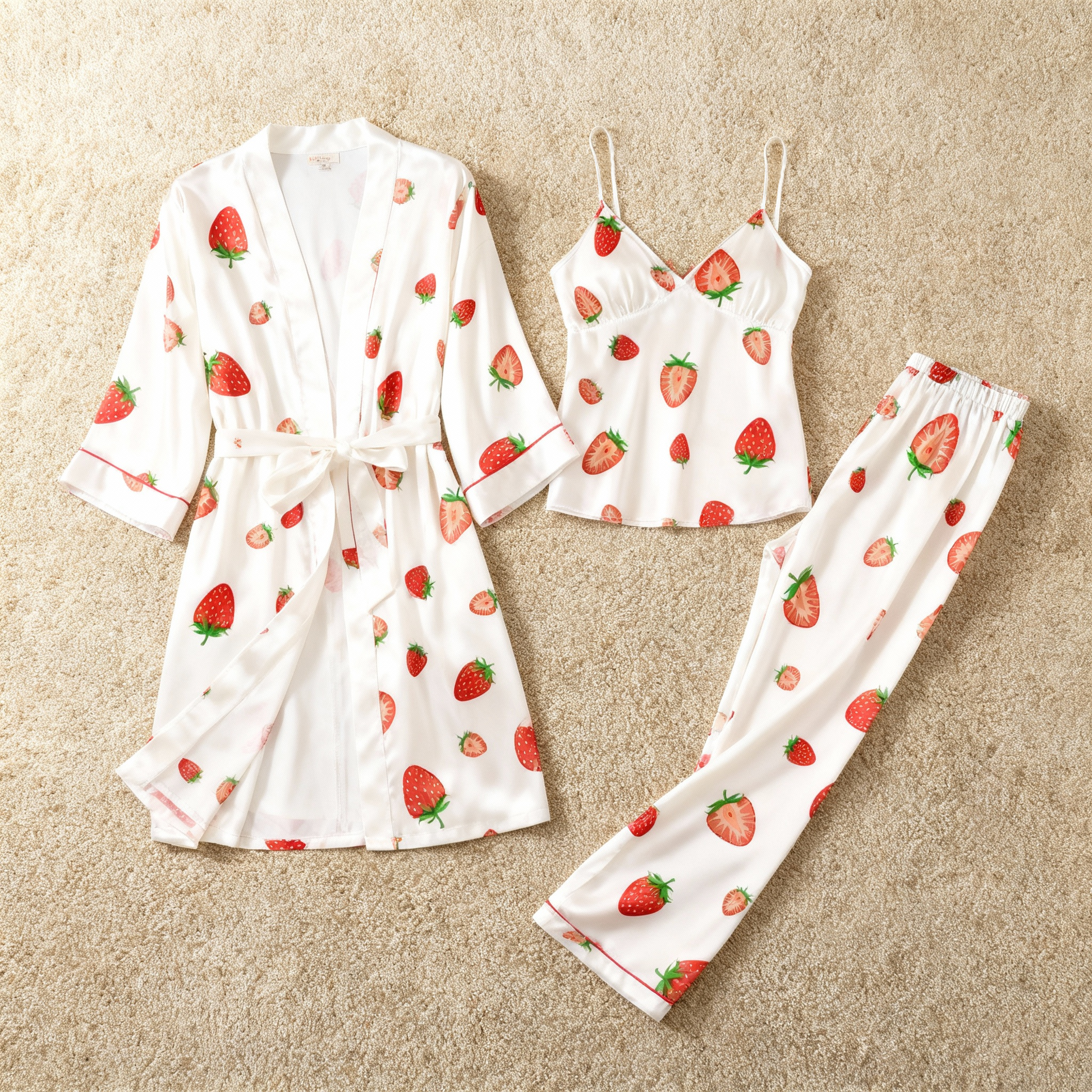 Women’s Satin 3-Piece Loungewear Set in Sweet Strawberry Style