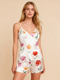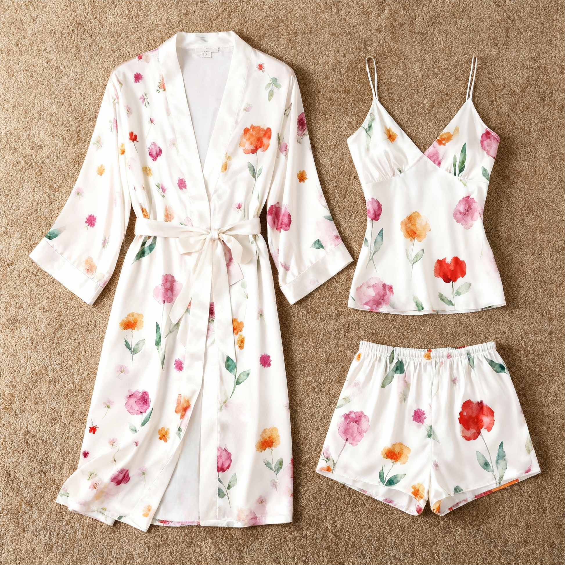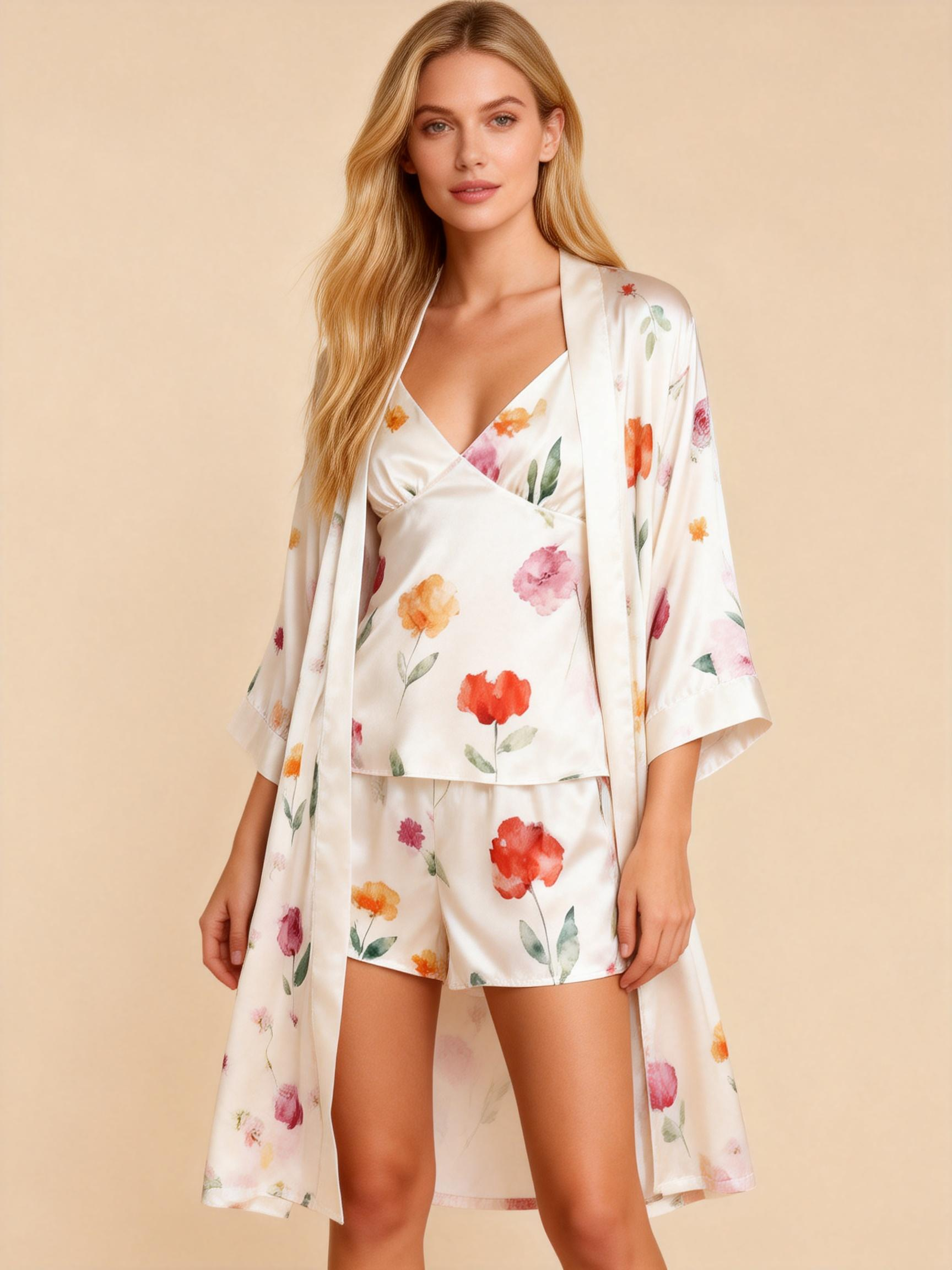 Women’s Satin Sleepwear Set – Floral Robe, Cami Top, and Shorts