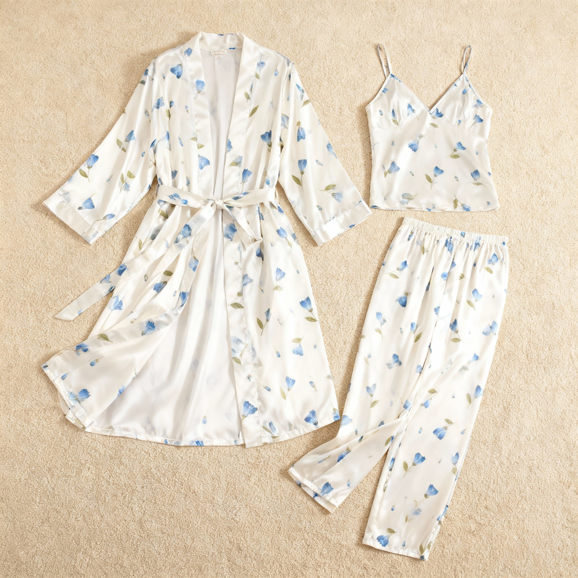 Women’s Silky Satin Homewear Set with Watercolor Blue Floral Motifs
