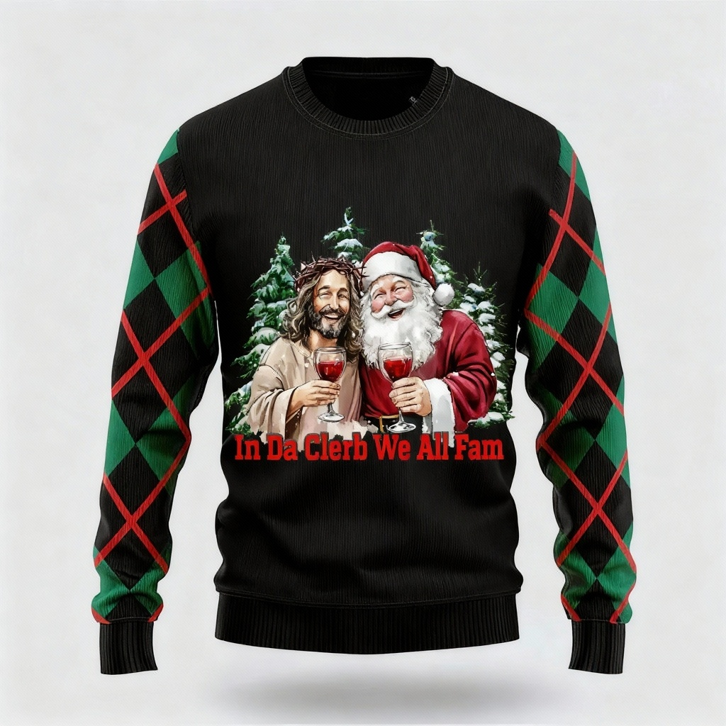 Jesus & Santa Claus Print - Maximalist Christmas Print Ugly Sweater